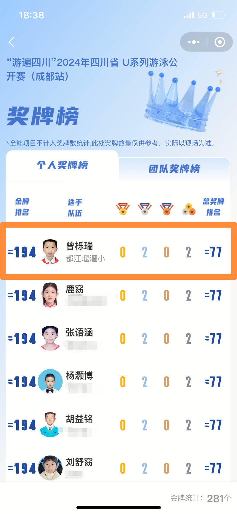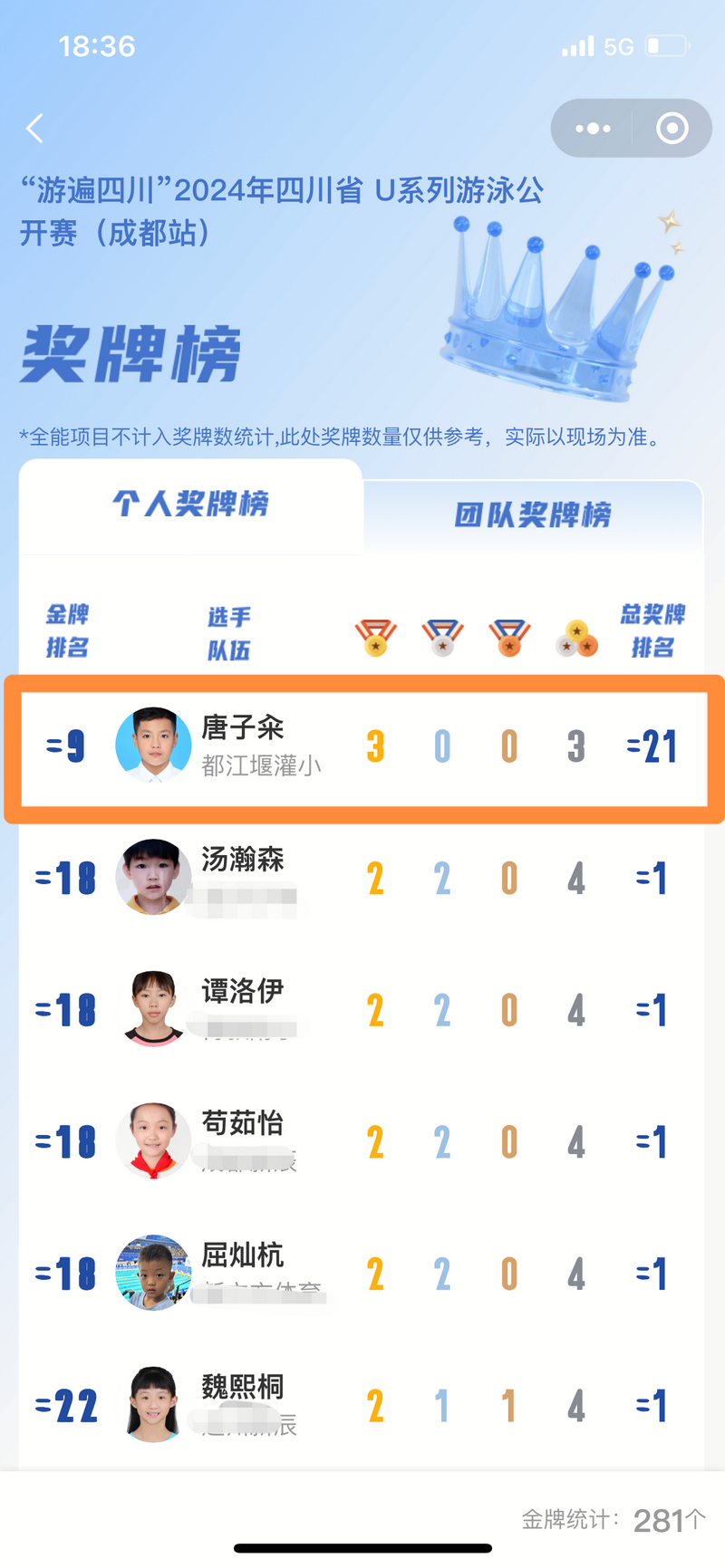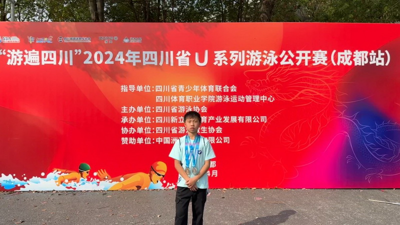 唐子籴:U11校园组男子100蝶第一名、200混第一名、100爬泳腿第一名。
