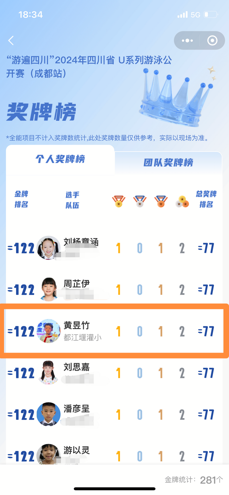 黄昱竹:U8校园组男子50蝶第一名、50仰第三名、100蛙第六名。