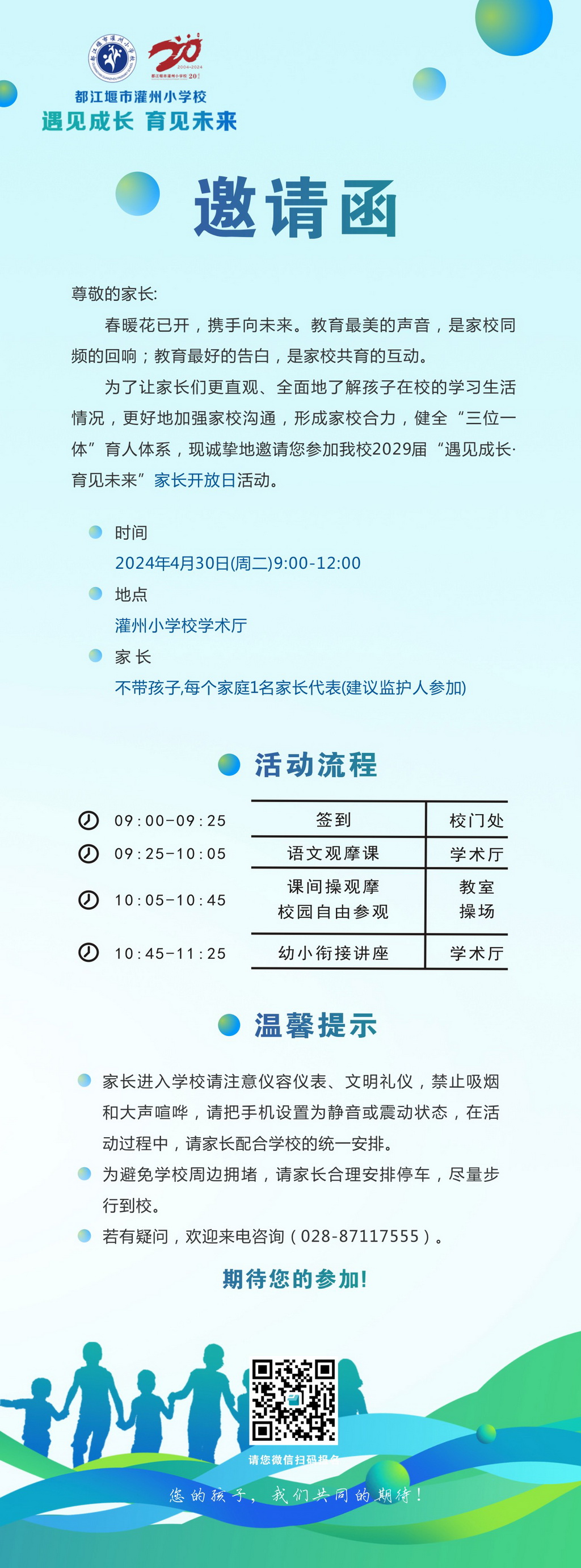 都江堰市灌州小学校2029届“遇见成长 育见未来”家长开放日活动邀请函
