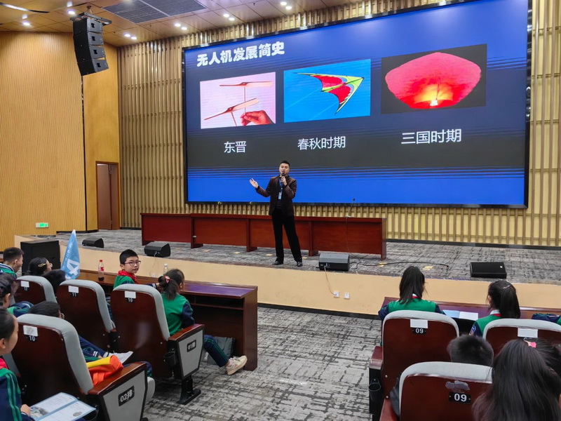 随后在报告厅,孩子们听了一场关于无人机的讲座,了解了无人机的机种、操作方法、用途等相关知识。孩子们热情洋溢,对无人机的航空知识充满了好奇。