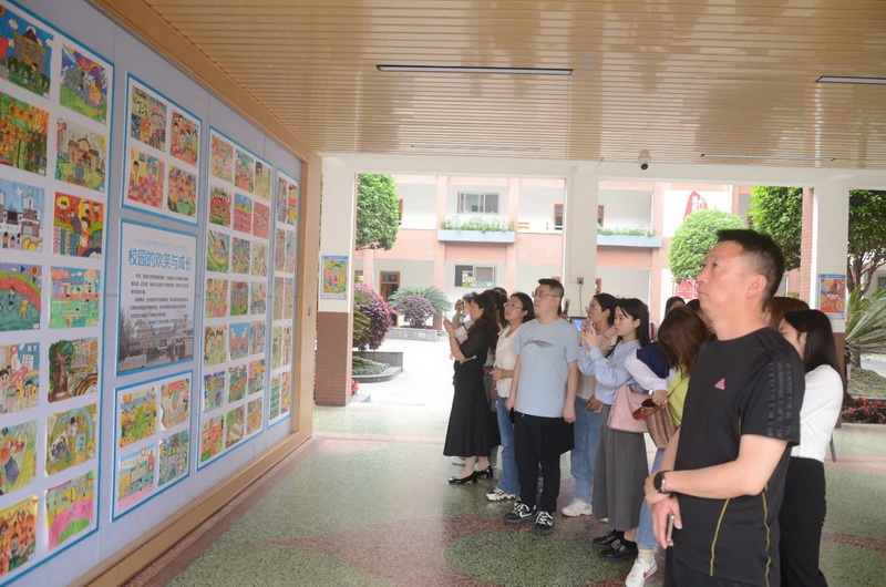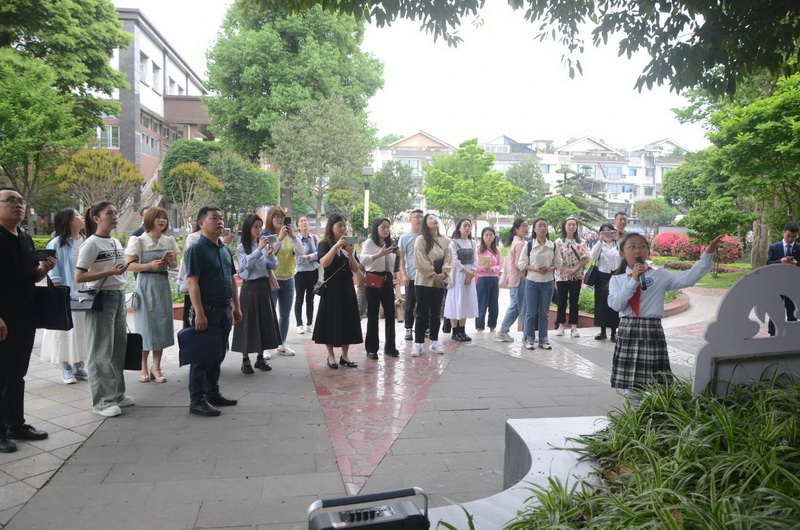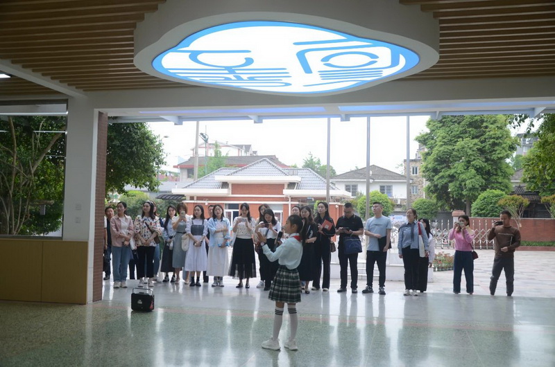 跟岗研修的老师们在学校红领巾志愿者的带领下参观校园。The teachers who followed the training program visited the campus under the guidance of the school's Red Scarf volunteers.