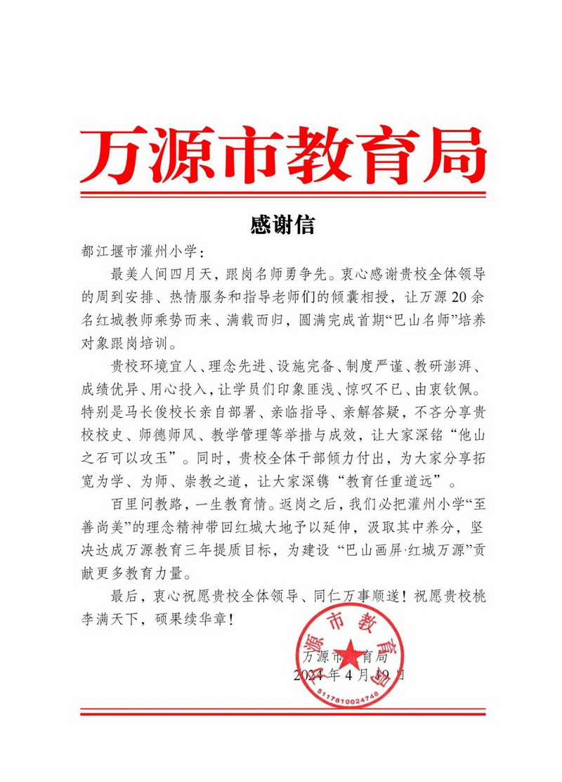 他山之石可以攻玉,我们相信,这次跟岗培训是一次共同成长、一起蜕变的宝贵经历,我校也将继续加强与万源市教育的交流与合作,为建设“巴山画屏·红城万源”贡献更多的教育力量。