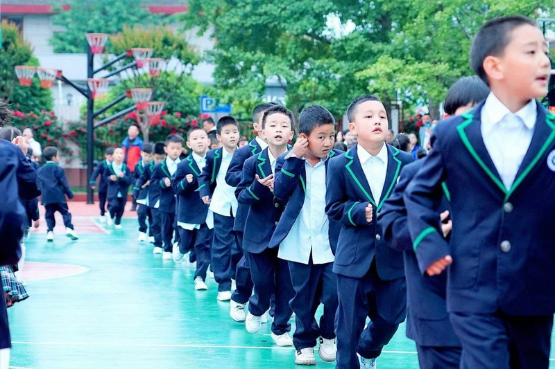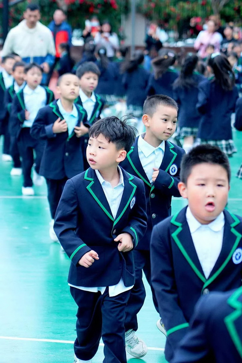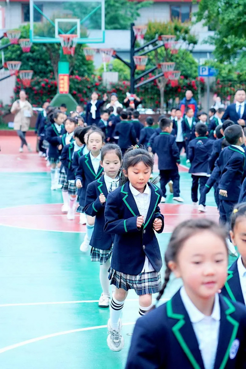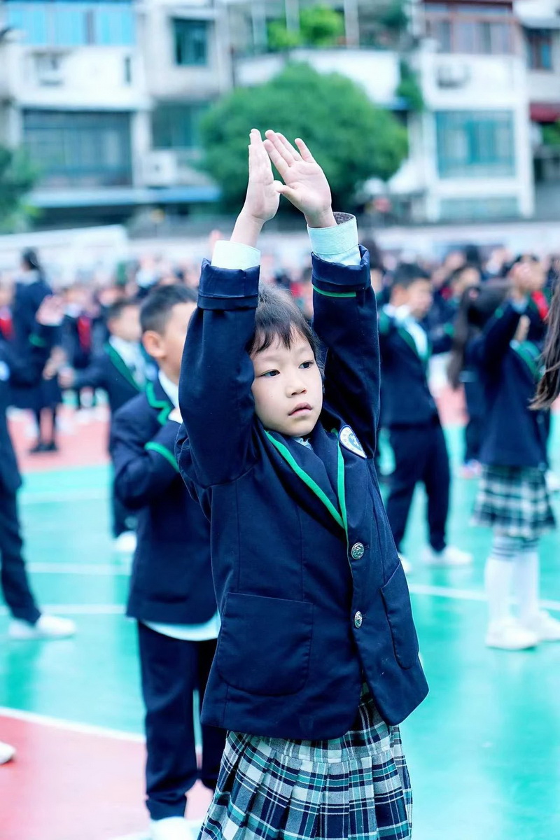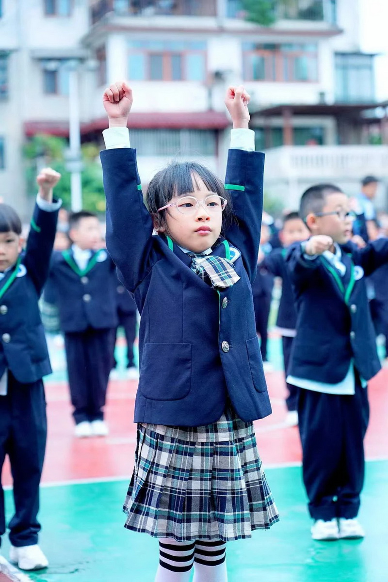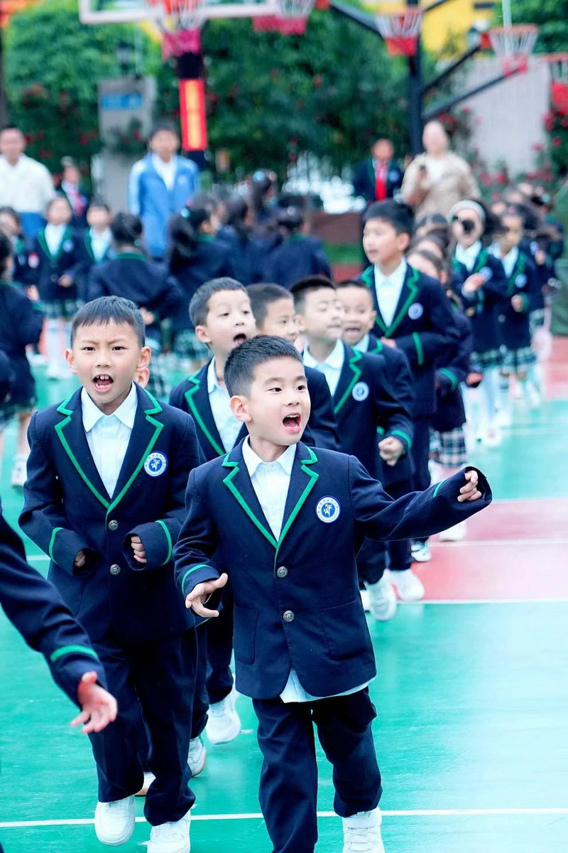 灿烂的笑脸、整齐的步伐、有力的臂膀,响亮的口号,一年级小朋友自信地展示着朝气蓬勃,活力向上的精神面貌。
