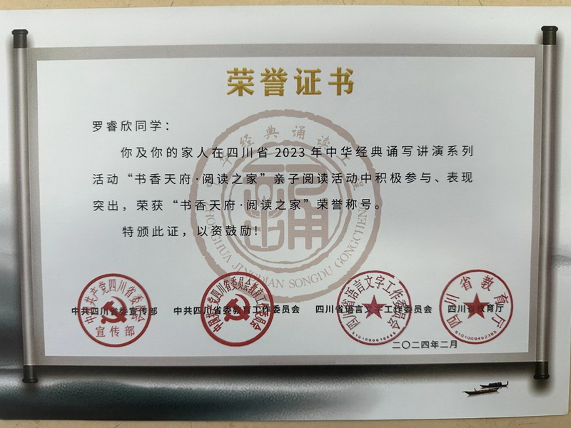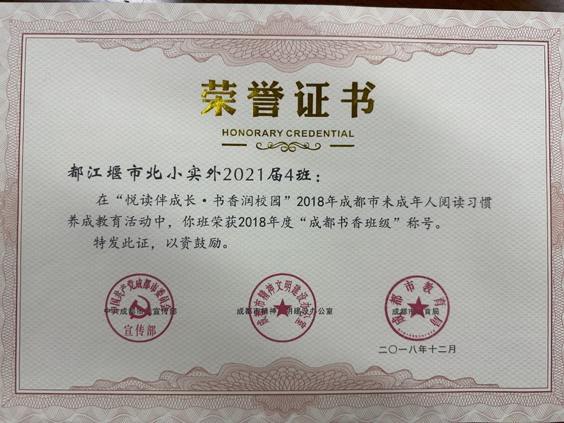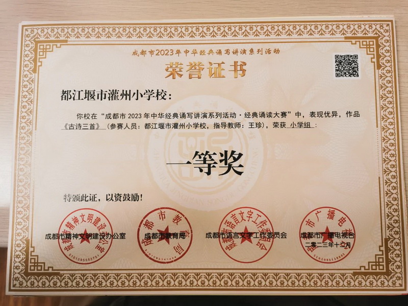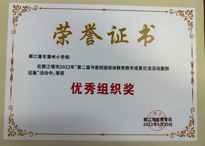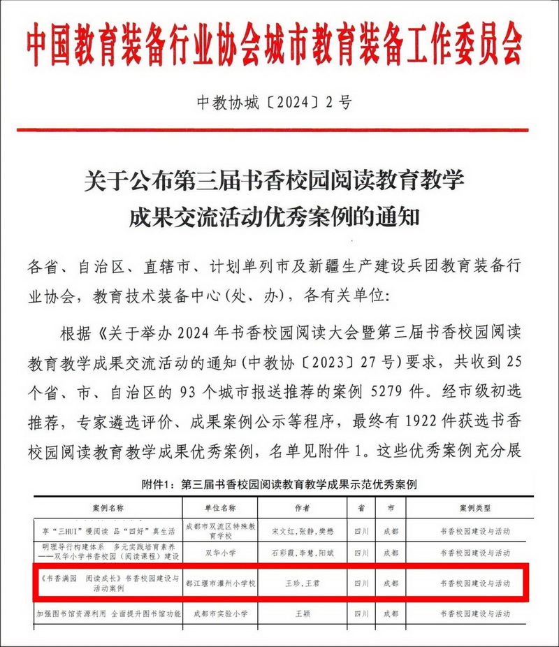 2023年全国第三届书香校园阅读教育教学成果案例评选活动中,我校书香校园建设与活动案例《书香满园 阅读成长》经成都市级初选推荐,专家遴选评价、成果案例公示等程序,最终被评选为全国示范优秀案例。