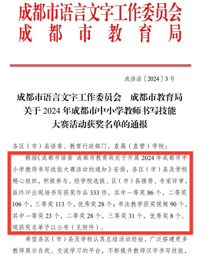 According to the "Notice of Chengdu Language Committee and Chengdu Education Bureau on Launching the 2024 Chengdu Primary and Secondary School Teachers' Writing Skills Competition", our school has meticulously organized and actively participated. Following the selection,Mr Xu Ranlin's pen calligraphy works and Miss Zhao Lei's video lessons stood out and were awarded the "First Prize" in both the pen calligraphy group of Chengdu and the Calligraphy Teaching Video .