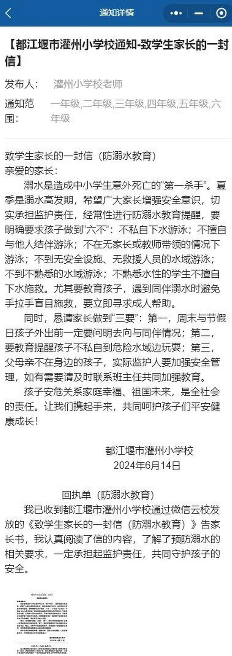 我校通过微信“云校”发布了《防溺水告家长书》,督促家长做好孩子的监管,教育,努力尽到监护责任。
