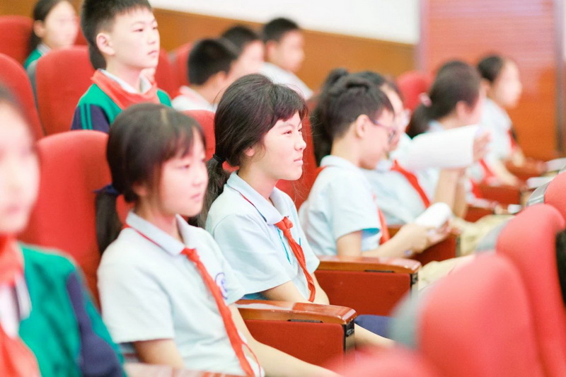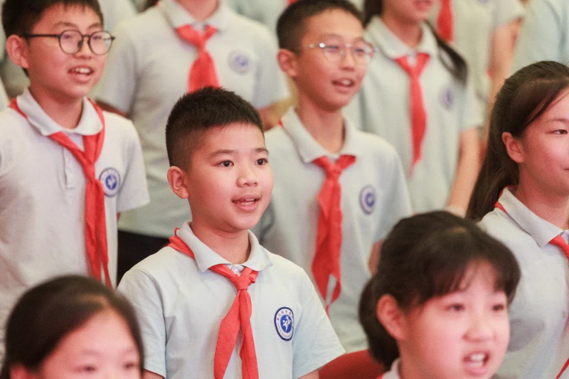 我们在阳光下成长,沐浴祖国的温暖,红领巾随风飘扬,把未来点燃。毕业生们慷慨激昂地朗诵《中华少年》,来表达对祖国的热爱与自豪之情。