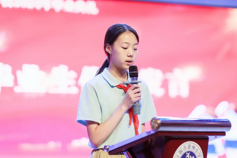说不完的感谢,道不尽的师生情意。六(4)中队张湲悉同学作为毕业生代表上台发言,她回顾了自己在学校度过的美好时光,感谢母校六年来的培养,感谢老师们孜孜不倦的教诲。