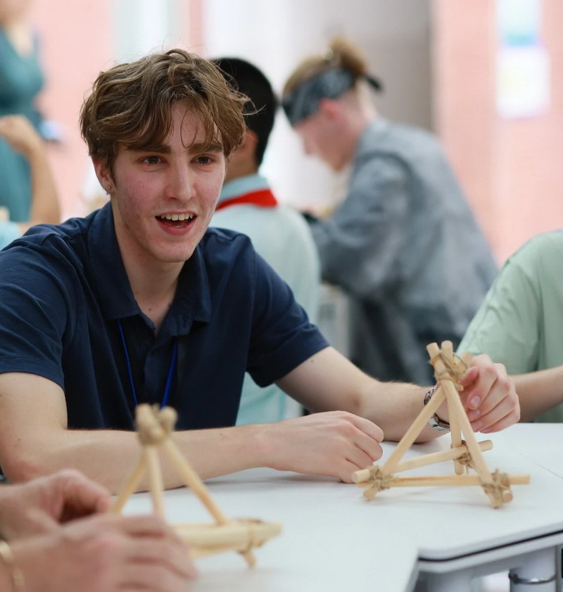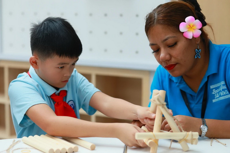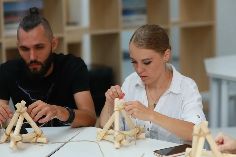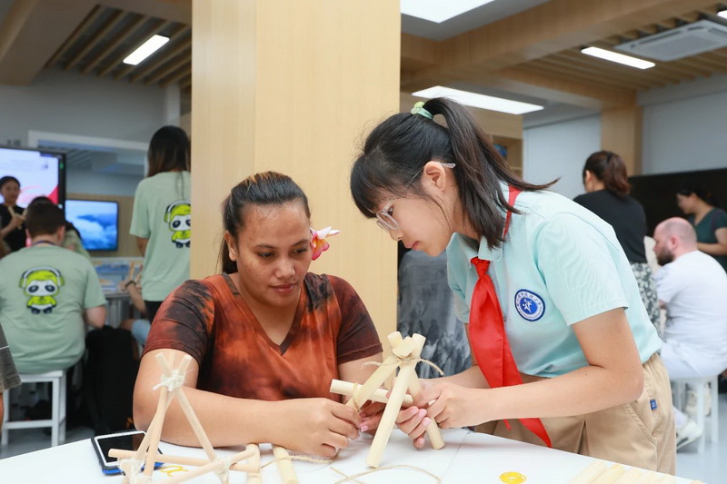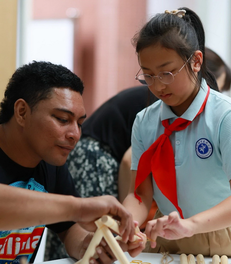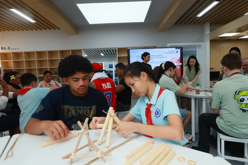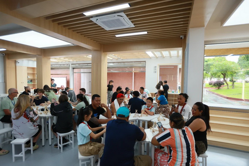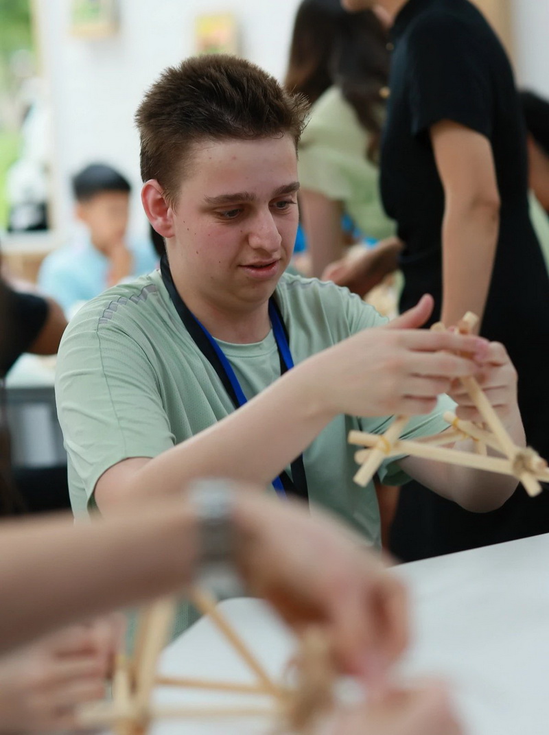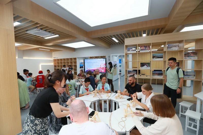 活动最后,国际友人在我校“都江堰文化体验中心”了解了两千年前都江堰堰工使用的“高科技”——杩槎,并在我校师生的陪同下一起动手制作杩槎,感受中国古代人民智慧的水工技术。