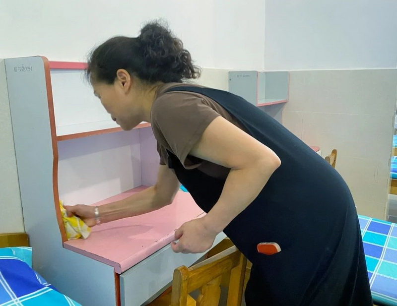 为学营造良好寝室环境,生活老师细致地对每个角落进行消毒与清洁,做到不留死角、不留盲区。