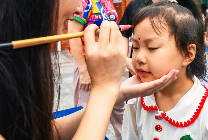Stepping into the school gate, the teachers held vermilion pens and gently touched the children's foreheads, implying vermilion enlightening.