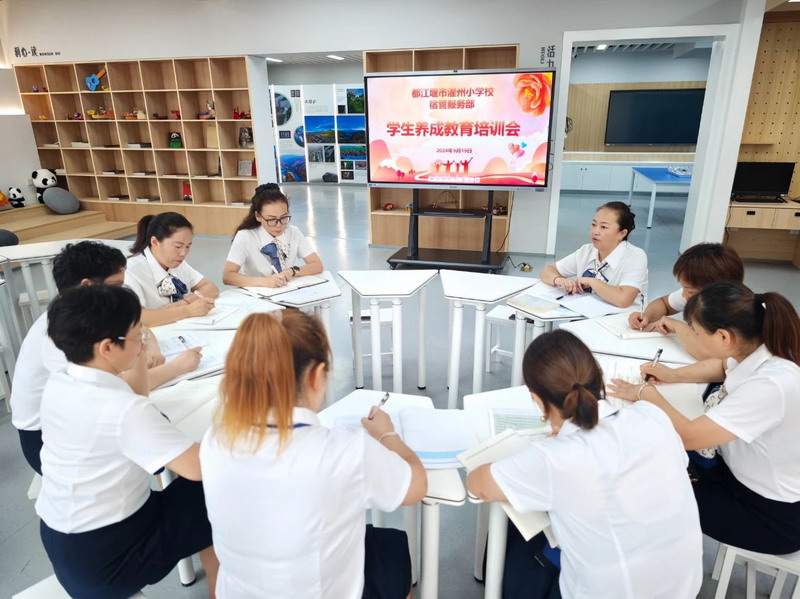 于燕主任带领宿管服务部生活老师进行“养成教育培训会”,强调习惯养成的一些细节举措,会中生活老师分享了许多关于习惯养成切实可行的方法。Director Yu of our school led the dormitory management service department to conduct a training meeting on habit formation.