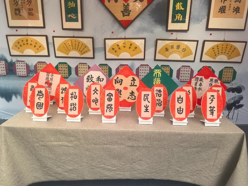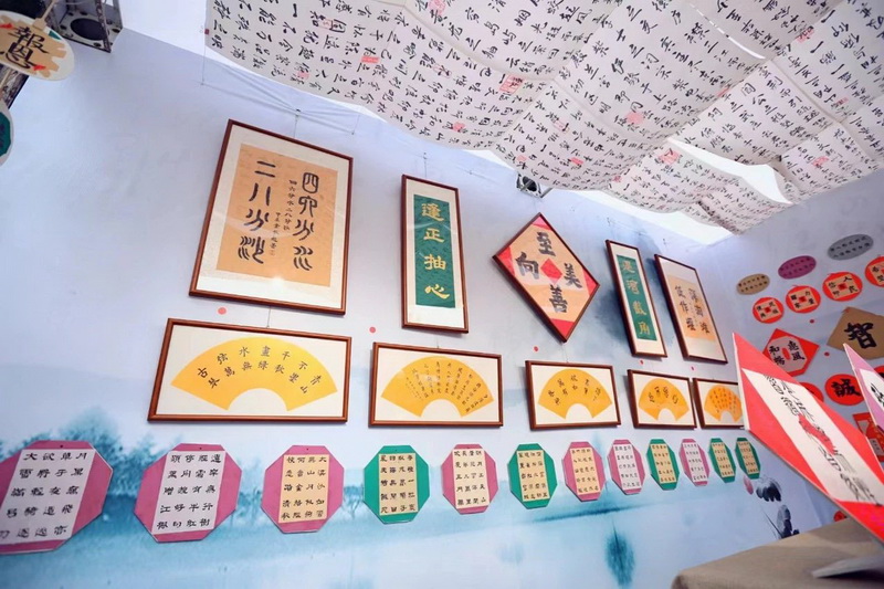 书法作品展示区,呈现了关于都江堰的诗句及学校的办学理念,彰显了展览的文化内涵与教育意义。