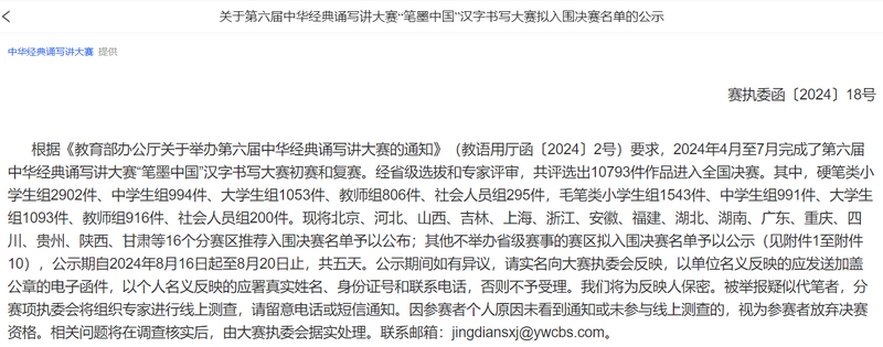 Mr. Xu Ranlin from our school has qualified for the finals of the "Chinese Characters Writing Contest" under the "Calligraphy in China" category of the 6th Chinese Classics Reading, Writing, and Speaking Contest hosted by the General Office of the Ministry of Education, with his hard-tip pen calligraphy work featuring an excerpt from "The Youth of China".