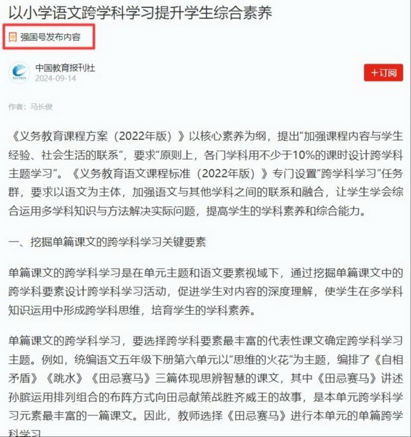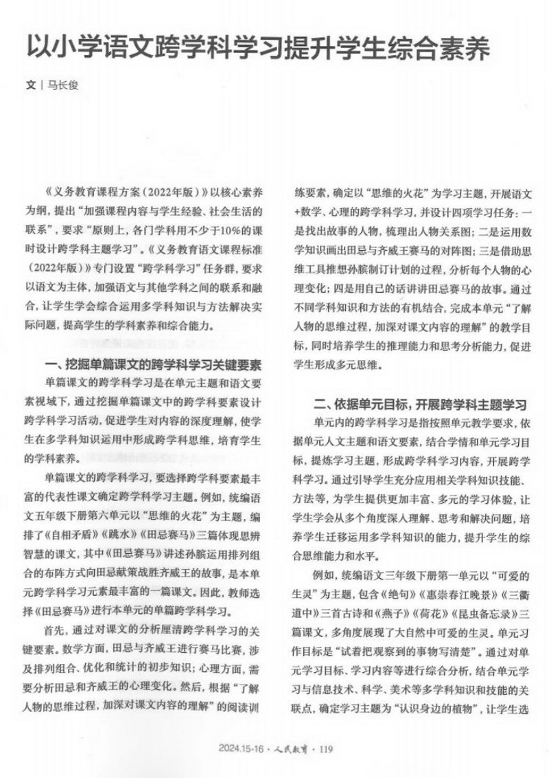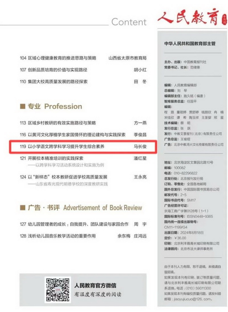 由中华人民共和国教育部主管的国家级教育类核心期刊《人民教育》(2024年第15-16期)刊登我校文章《以小学语文跨学科学习提升学生综合素养》一文。