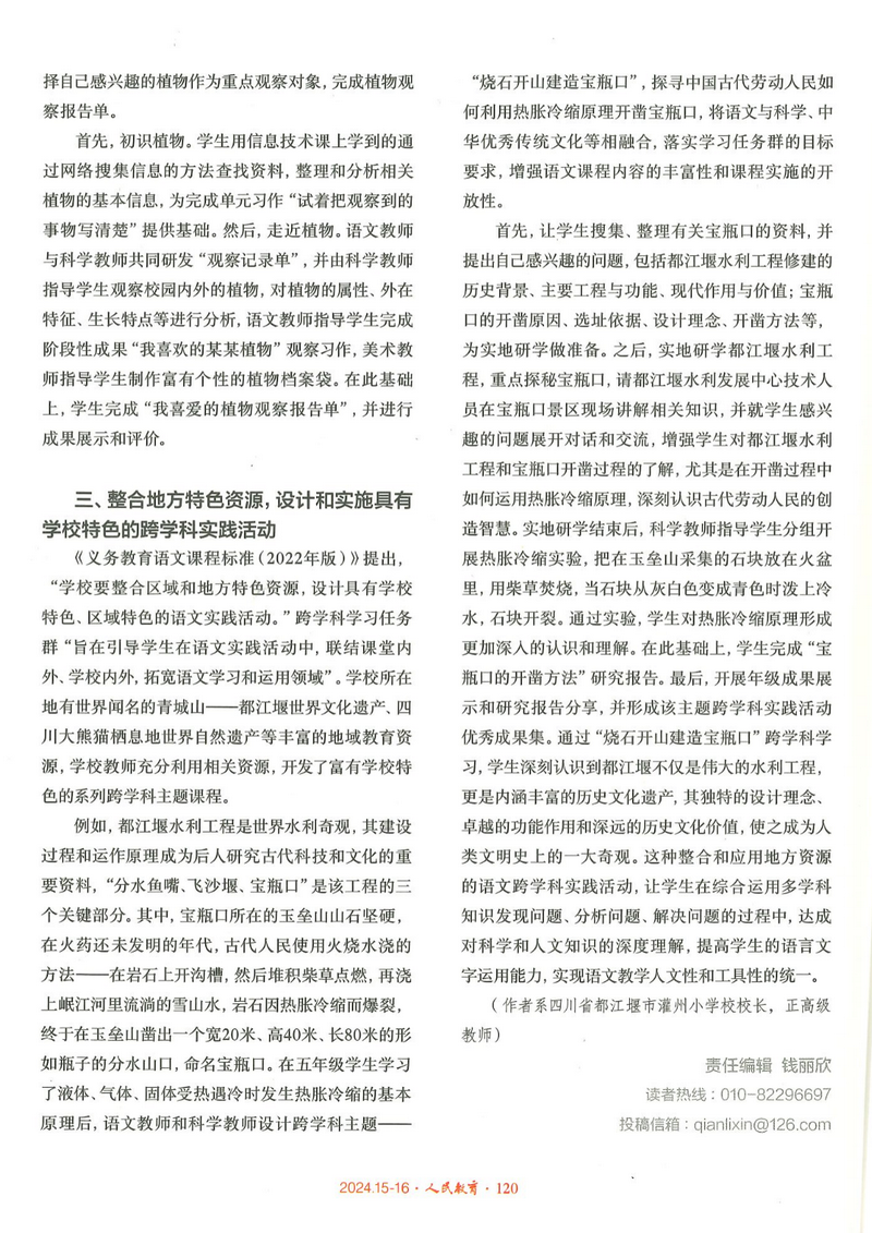 文章从如何挖掘单篇课文的跨学科学习关键要素,到依据单元目标开展跨学科主题学习,再到如何整合地方特色资源设计和实施具有学校特色的跨学科实践活动三个方面进行语文跨学科学习的探索与实践。从学科拼盘跨越到学科融合,让课堂学习过程有意思、有意义、有可能,实现语文教学人文性和工具性的统一。