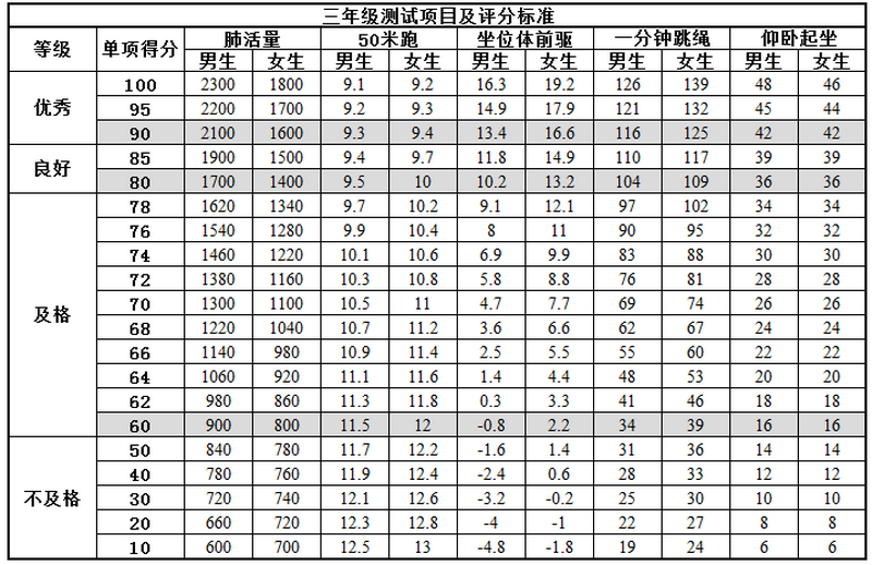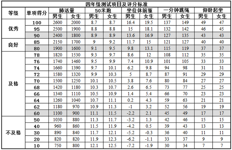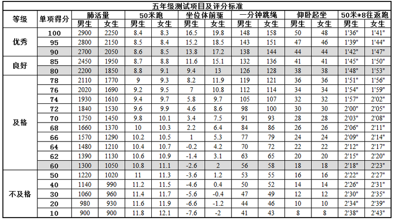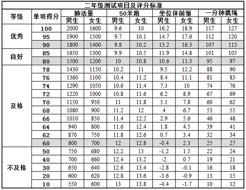 附:一至六年级体测评分标准