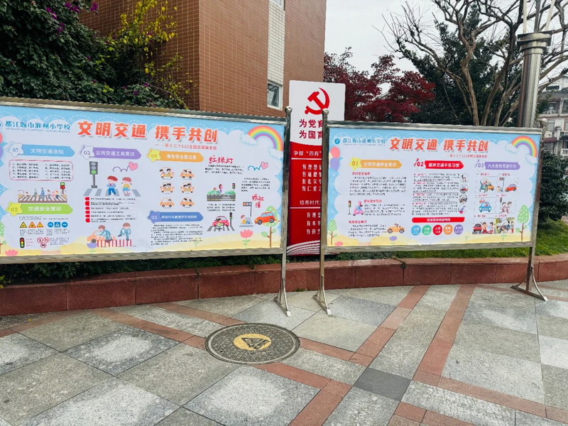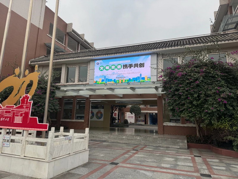 学校利用电子屏播放宣传标语,校园宣传展板等营造良好的交通安全知识学习氛围,切实营造交通文明出行的校园氛围。