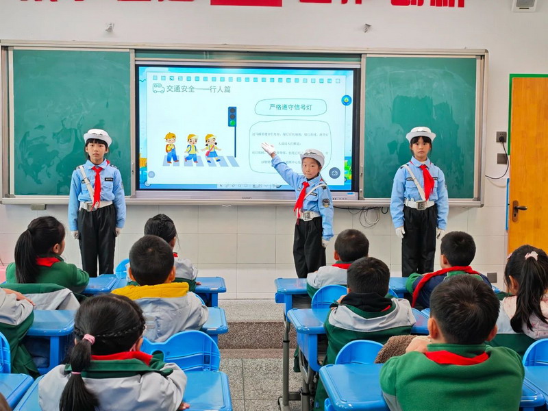 各中队中队辅导员利用班会课带领学生学习交通安全知识,图文讲解、互动发问、情景分析,队员们跟随老师一起了解交通规则,规避潜在危险,做到防微杜渐,让出行更加安全。