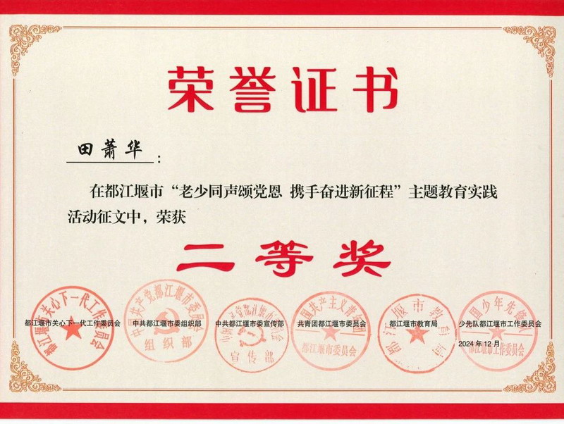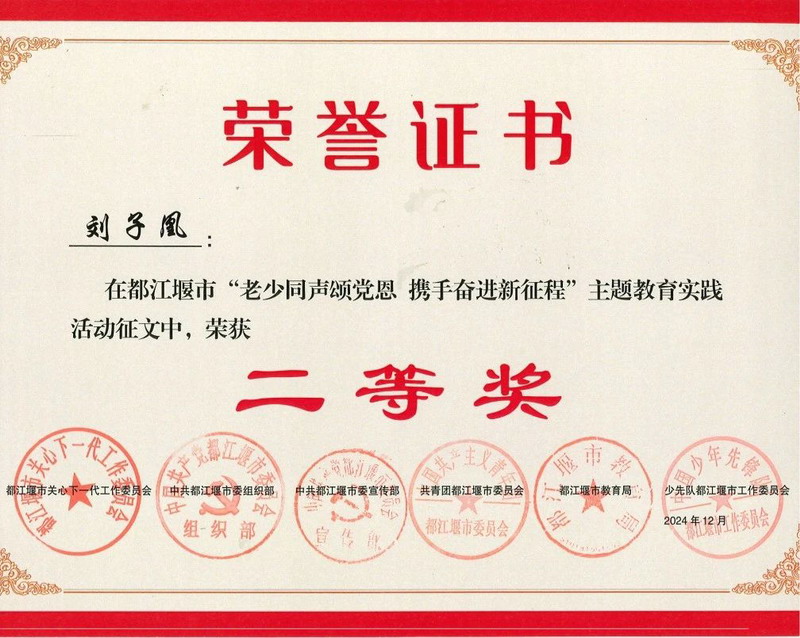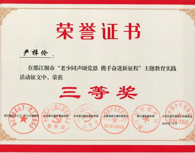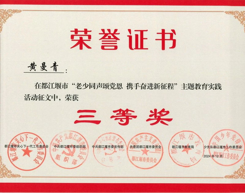 Recently, Dujiangyan Labor Union Care for the Next Generation Work Committee announced the list of winners. Our students, demonstrating outstanding performance and deep patriotic sentiments, won the following awards in the thematic essay competition of the educational practice activity "Me and My Motherland".
