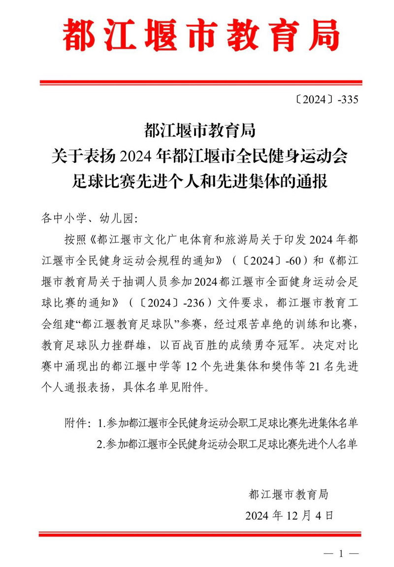 From September to November 2024, Mr. Li Kun, Mr. Wang Tianliang, and Mr. Wu Minggang, three esteemed teachers from our school joined the "Dujiangyan Education Football Team" . They represented the Dujiangyan City Education Bureau in the Dujiangyan National Fitness Games Football Match.