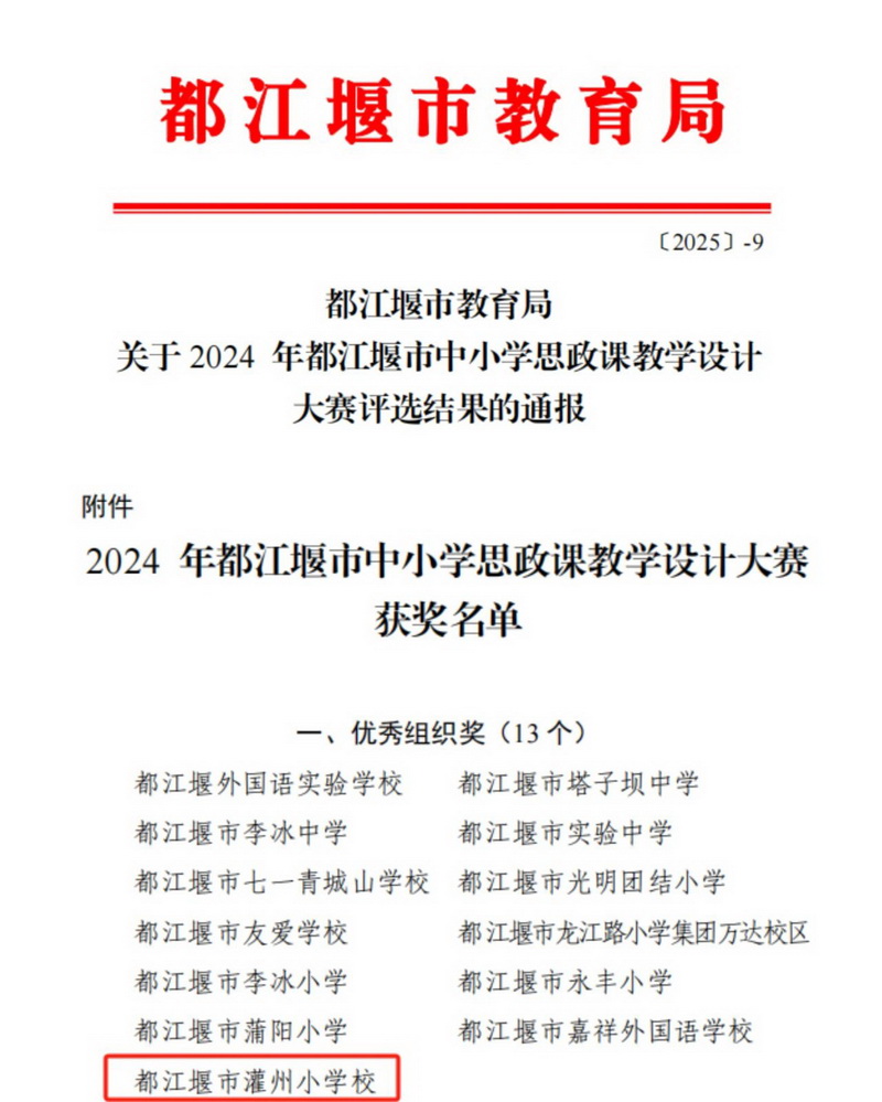 In the 2024 Dujiangyan Primary and Secondary School Ideological and Political Teaching Design Contest, our school won lots awards.