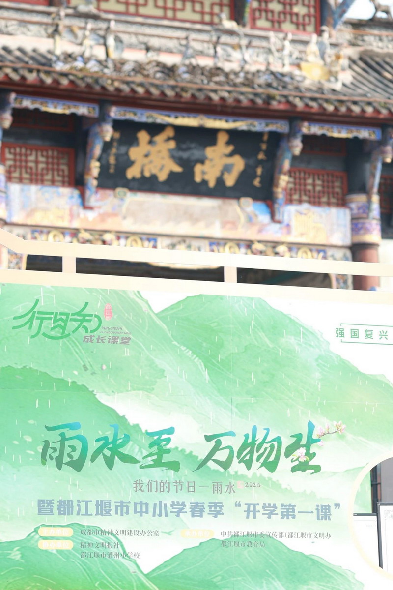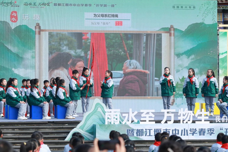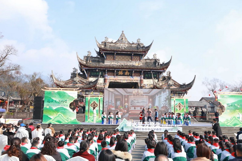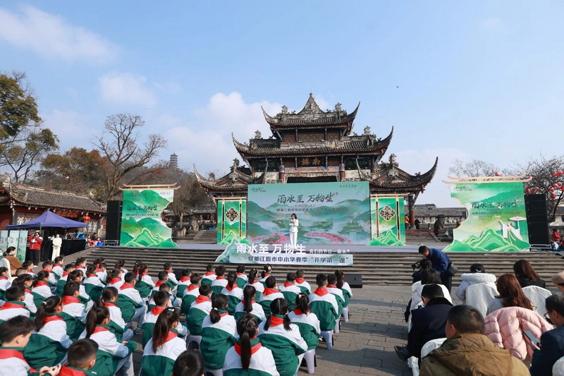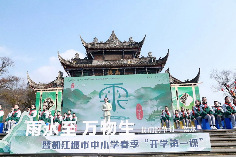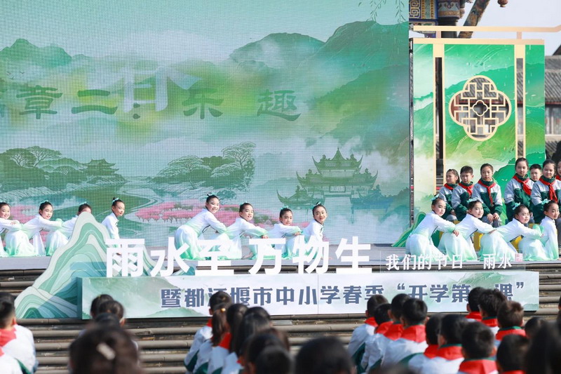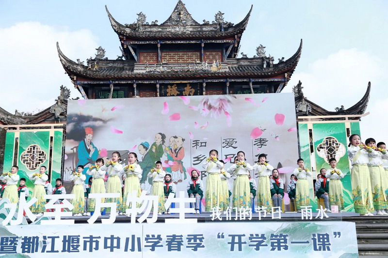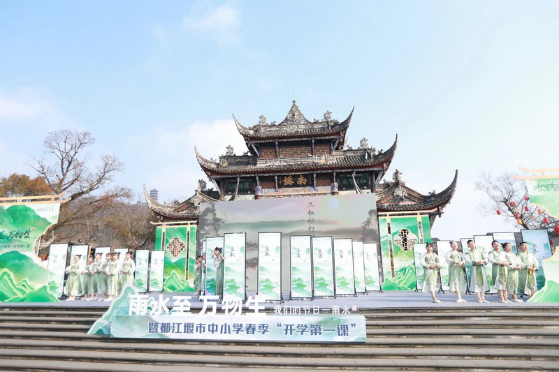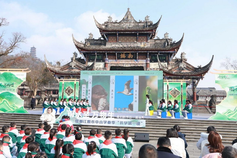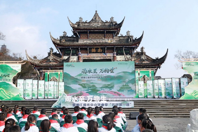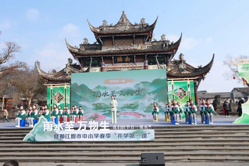 On February 17th, the Nanqiao Square in Dujiangyan City, Sichuan Province, was filled with the warmth of spring as the city's "Our Festival: Rain Water" and the spring season's "First Lesson of the Semester" event took place here.