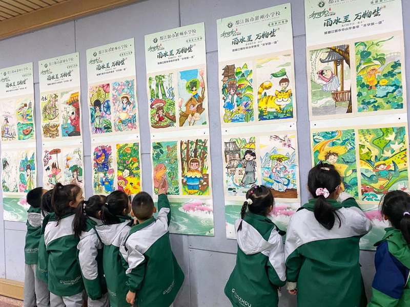 Spring rain is nature's gentlest brush. Like fine ox hair or delicate needles, it flutters down upon the earth. Please enjoy the spring rain painted by children.