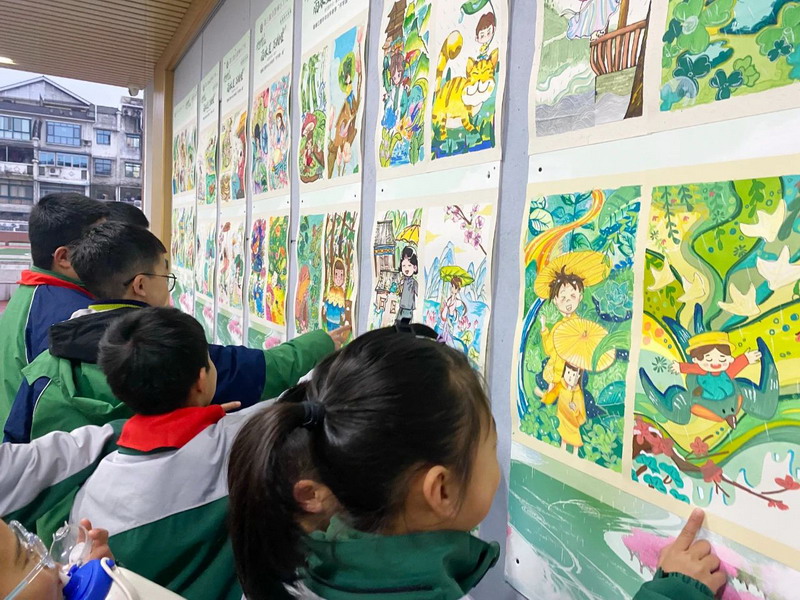 春雨,是大自然最温柔的笔触。它如牛毛,似花针,纷纷扬扬地洒落人间。在孩子们的笔下,春雨是家乡那细密雨丝编织成的朦胧纱幕,轻轻笼罩着白墙黑瓦的古宅,河水在雨滴的亲吻下泛起层层涟漪,船儿悠然划过,船桨荡起的水波与雨痕交织,宛如一幅淡雅的水墨画。有的画作呈现了春雨中的山林,雨滴顺着翠绿的叶片滑落,打在松软的泥土上,唤醒了沉睡的春笋,它们迫不及待地破土而出,感受着春天的气息。