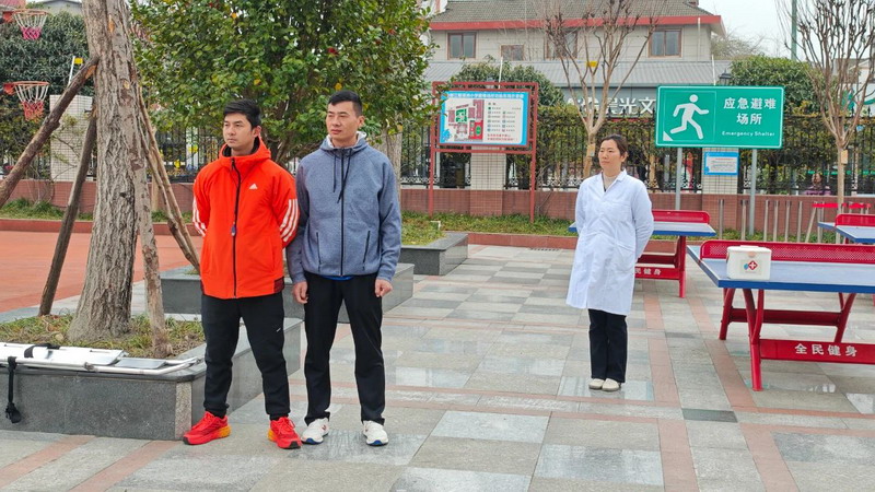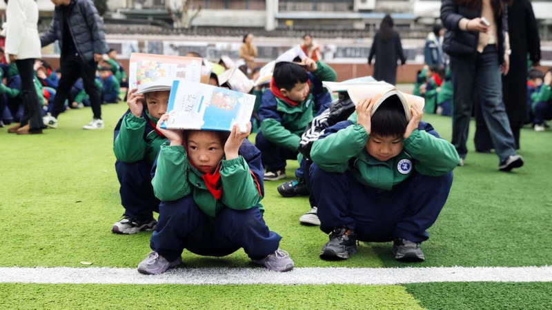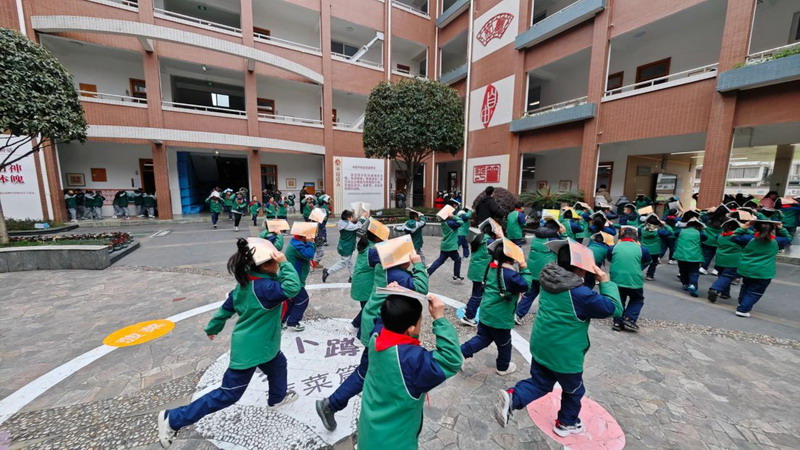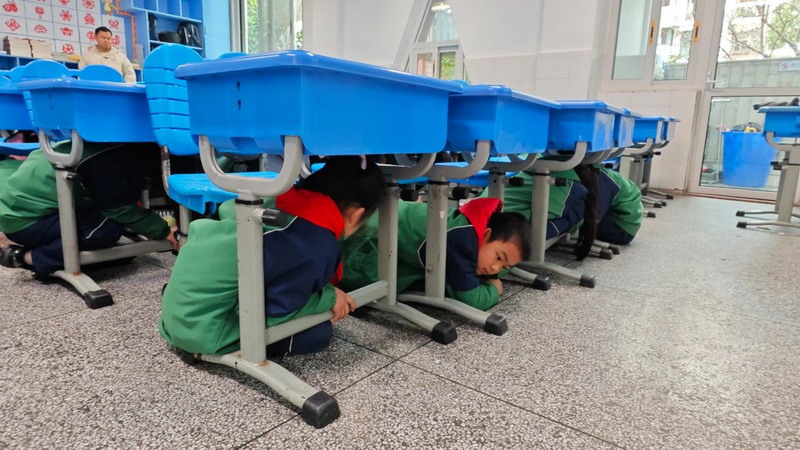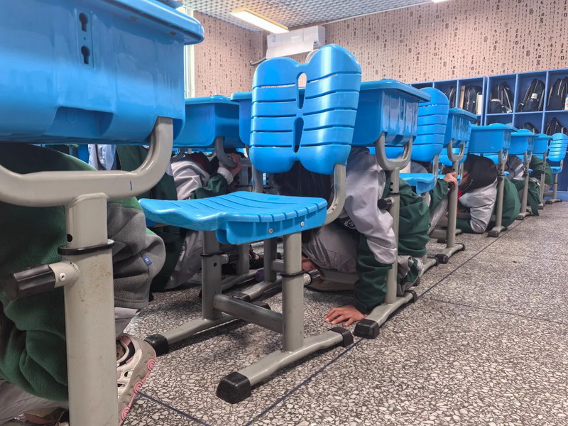 At 9:50 a.m., the first alarm sounded, prompting all participants to assume emergency postures. Students shielded their heads with their hands and crouched under desks or near load-bearing columns—practicing the “triangle of life” technique. Three minutes later, a second alarm signaled the evacuation phase. Teachers dynamically directed batches of students through designated routes to the sports field, preventing cross-traffic congestion. Classes remained assembled at assigned zones awaiting further instructions.