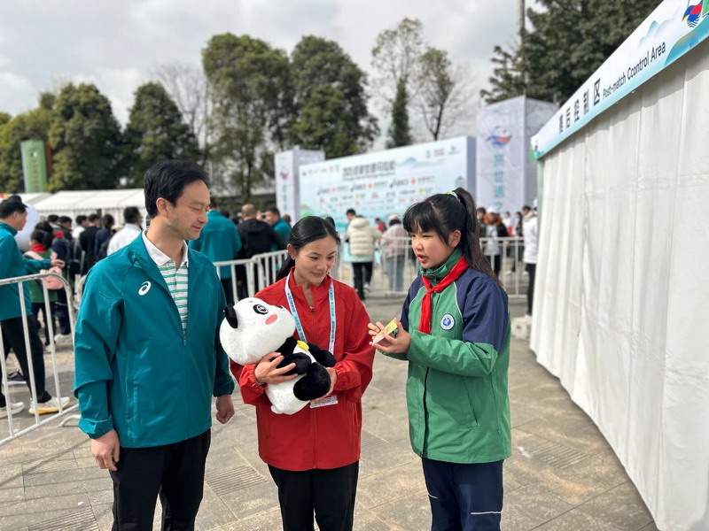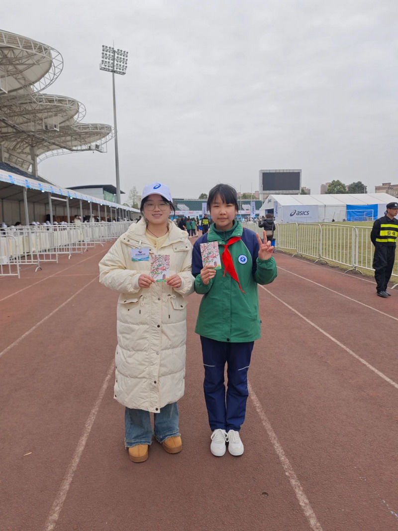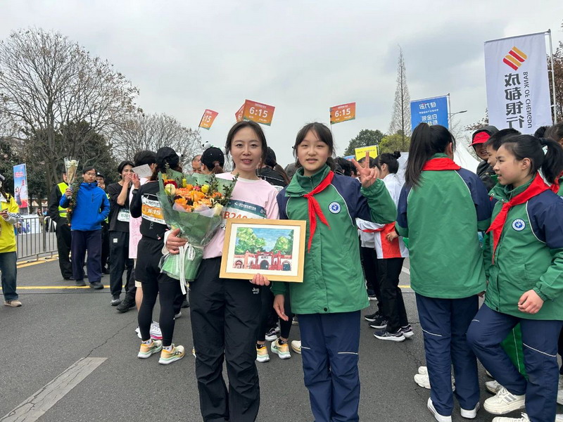 赛事当天,我校学生代表都江堰市中小学生为获得全马女子组第三名(第一位中国籍)获奖运动员赠送学生手绘明信片。