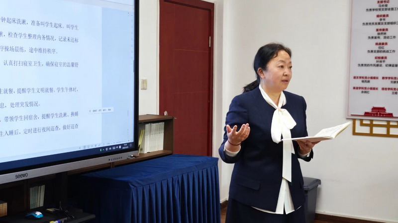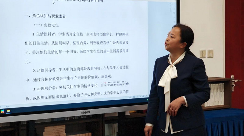 “律回春晖渐,万象始更新”。在校园生活中,生活教师扮演着不可或缺的角色。为更进一步提升生活教师队伍的专业素养和管理水平,行政管理中心对生活教师开展培训。 As spring renews all things, dormitory teachers remain vital to campus life. To enhance their expertise, the Administrative Management Center organized a professional training session. 行政管理中心于燕主任会上强调:生活老师应坚守高标准服务,以爱心为基石,细致服务学生,关注学生情绪、习惯与健康。