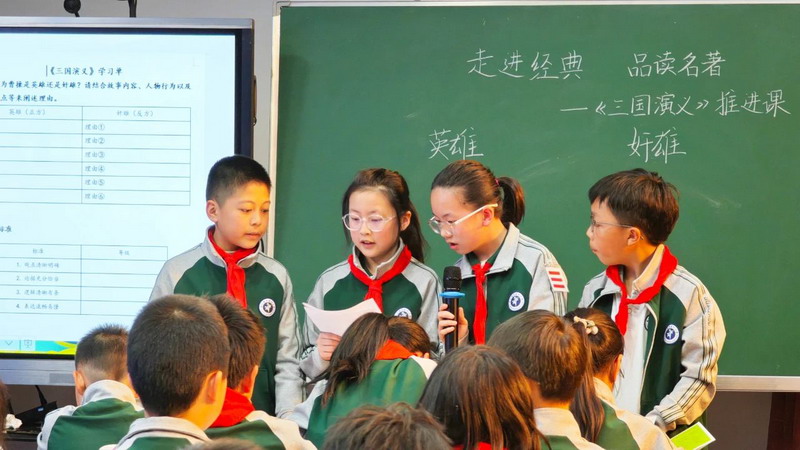 贾琳琅老师带领五(5)班学生通过梳理三国人物关系图构建,明晰故事背景与人物脉络。聚焦曹操,以不同故事分析人物性格,随后展开小组辩论,培养学生批判性思维与表达能力。最后,布置任务让学生深入阅读,分析其他人物,强化全面辩证看待历史人物的思维。此次课程助力学生深入理解《三国演义》,提升文学鉴赏与历史分析能力,激发学生对经典名著的热爱。