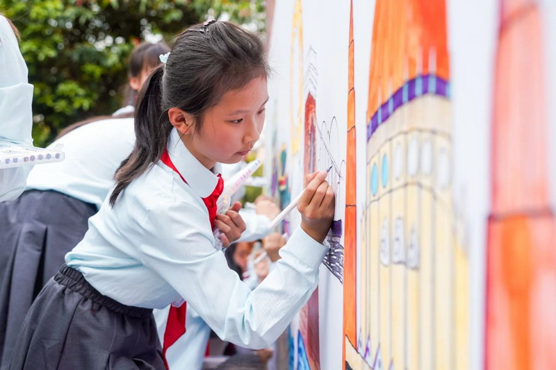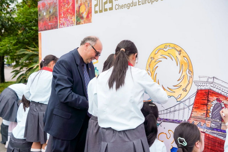 下午,彼得先生与我校学生在都江堰市工人文化宫共同完成了一幅长达5米的主题画作,画卷以成都、都江堰、匈牙利特色建筑为元素,通过抽象线条与写意色彩交融,展现“和而不同”的艺术理念。这幅作品不仅是中匈友谊的象征,更为两国民间文化交流增添了浓墨重彩的一笔。
