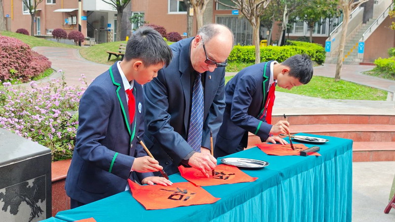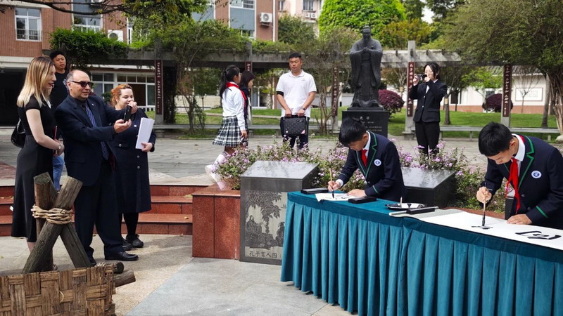 在红领巾志愿者的陪同下,彼得先生漫步灌州校园,深度体验了书法、熊猫泥塑等特色课程。他亲自执笔尝试毛笔字书写,感受中国传统文化中蕴含的匠心与哲学。活动尾声,我校学生以一首古筝曲《高山流水》送别客人,寓意“知音难觅,友谊长存”。