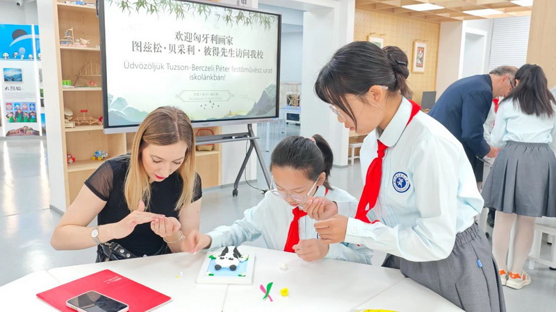 In the afternoon, Mr. Peter and our students completed a 5-meter-long theme painting, which depicts Chengdu, Dujiangyan and Hungarian characteristic buildings.