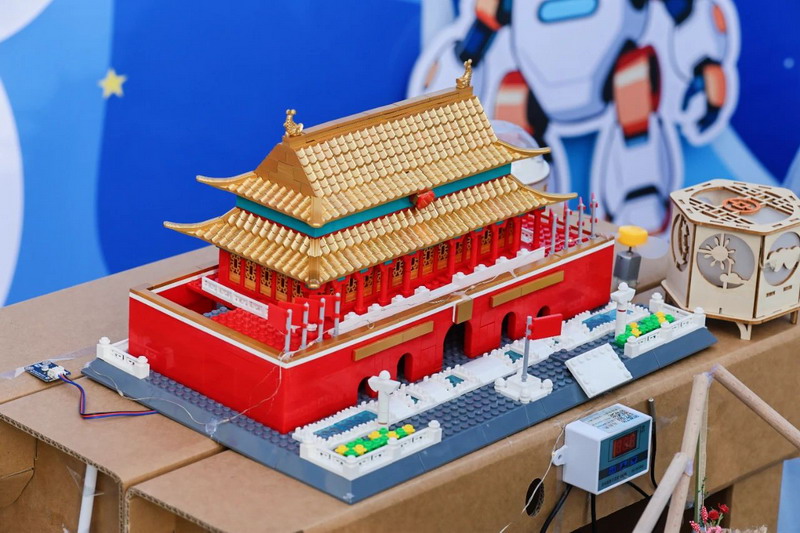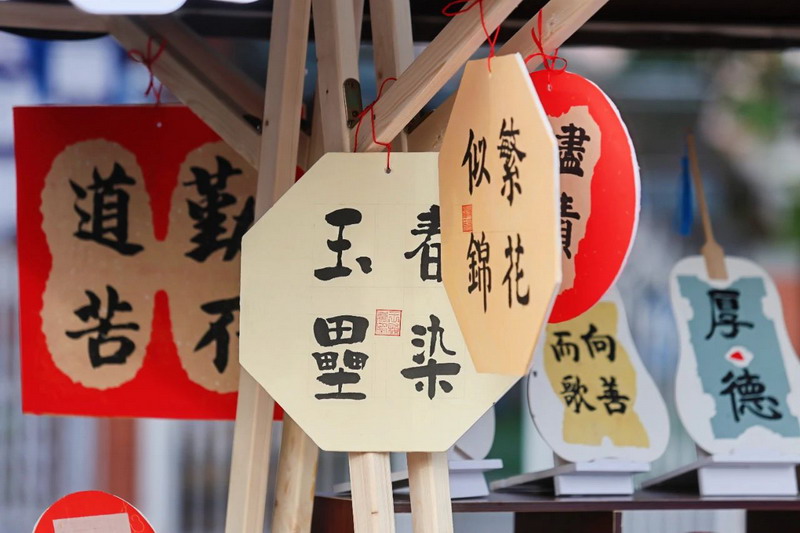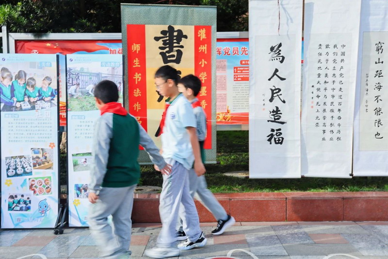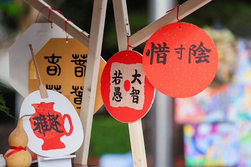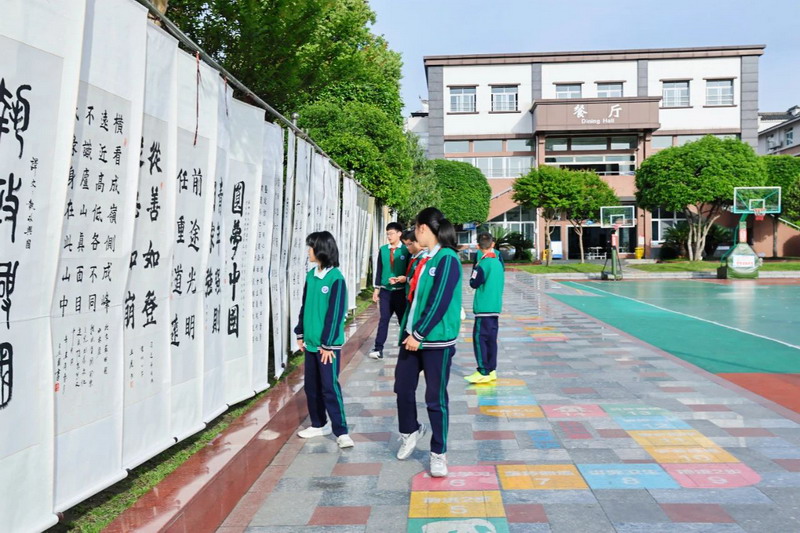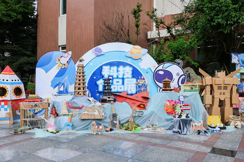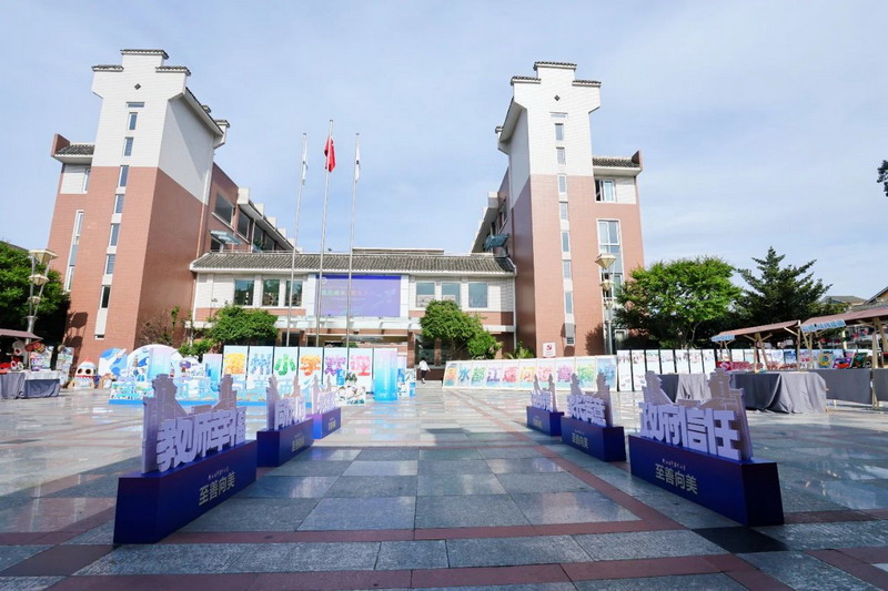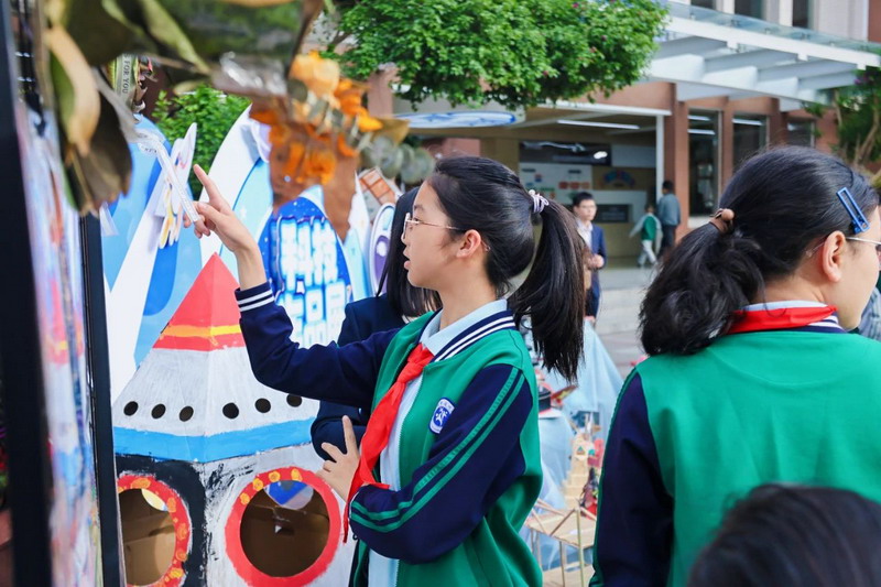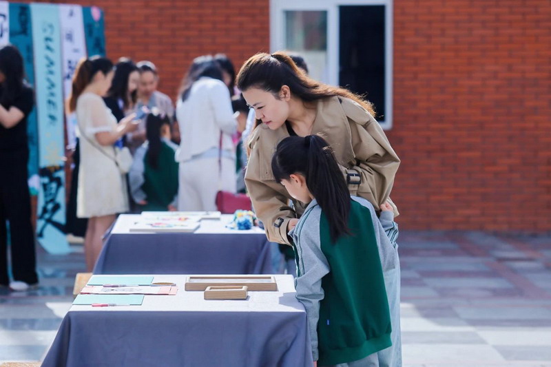 Upon entering the campus, the aesthetic education exhibition transforms into a dreamland. Children turn their imaginations into colorful paintings. Parents admire the artwork, capturing moments with their phones, creating a joyful atmosphere.