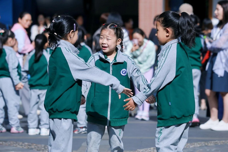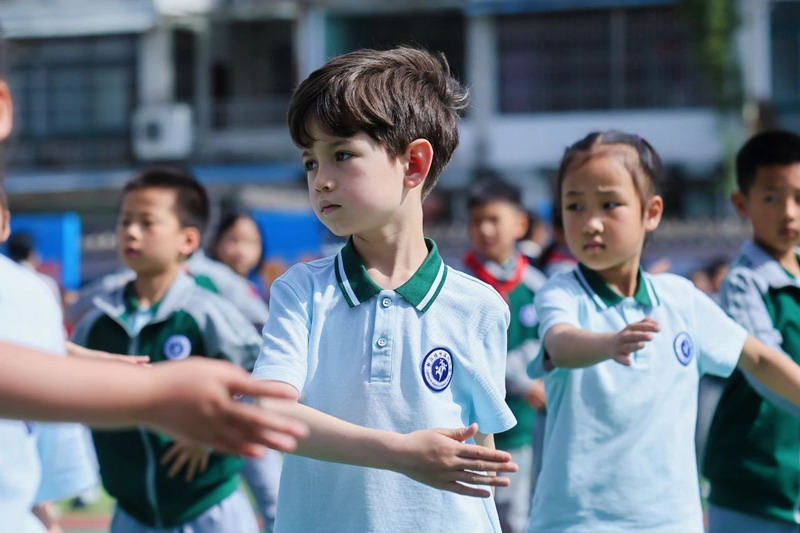 With cheerful music playing, children march to the playground for energetic exercises. Their movements brim with vitality, and parents capture these precious moments.