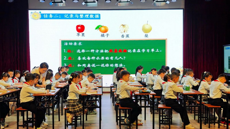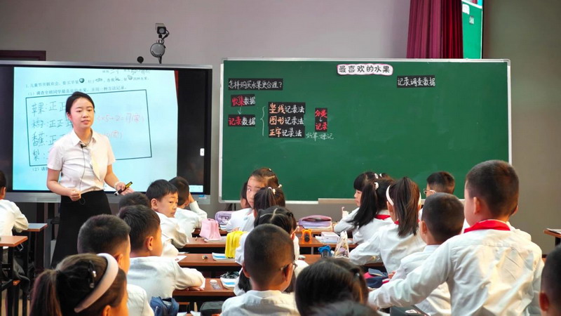 Teacher Huang Qing used the real-life scenario of "the favorite fruit of the class students" to collect data through voting and create statistical charts.