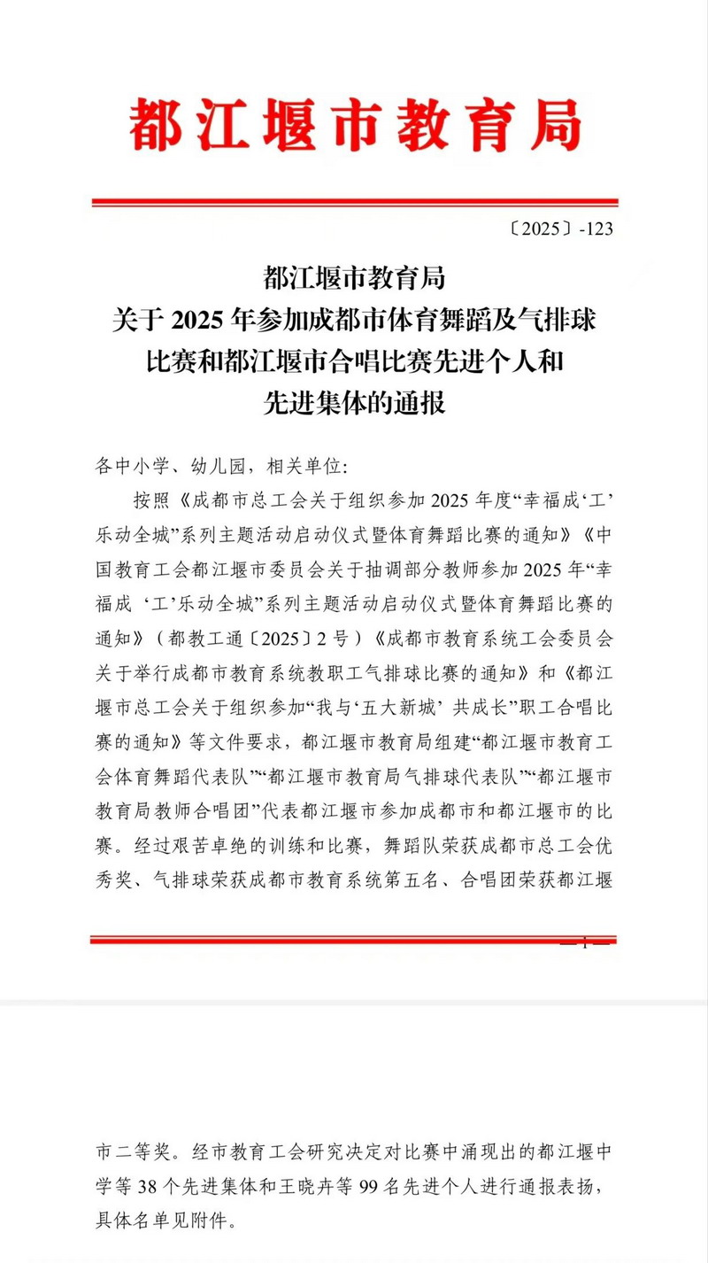 近日,2025“幸福成‘工’,乐动全城”系列主题活动圆满落幕。我校教师代表队凭借出色表现,在职工舞蹈比赛和气排球比赛两项赛事中斩获佳绩,充分展现了教职工团结奋进、拼搏进取的精神风貌。同时,学校被授予“先进集体”荣誉称号,王娅老师、邓兰老师、刘双玥老师、王诗琦老师、党延鹏老师、韩中泉老师荣获“先进个人”称号。