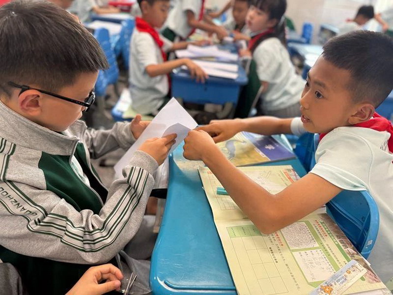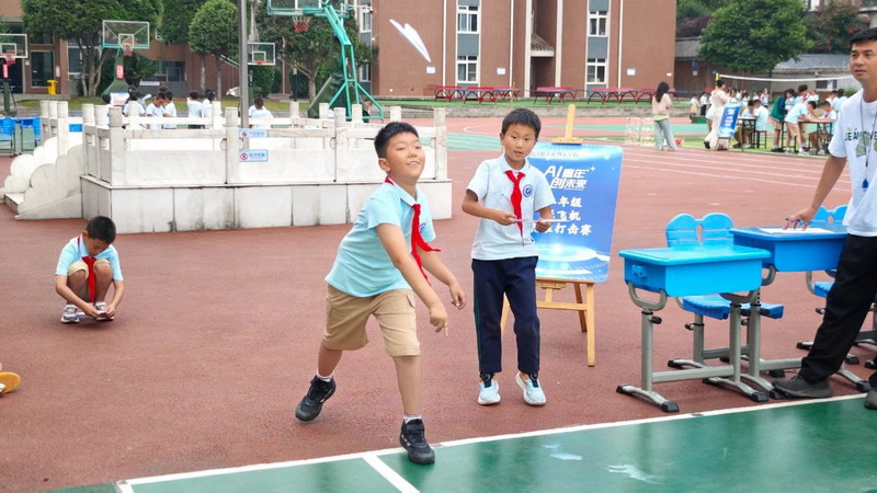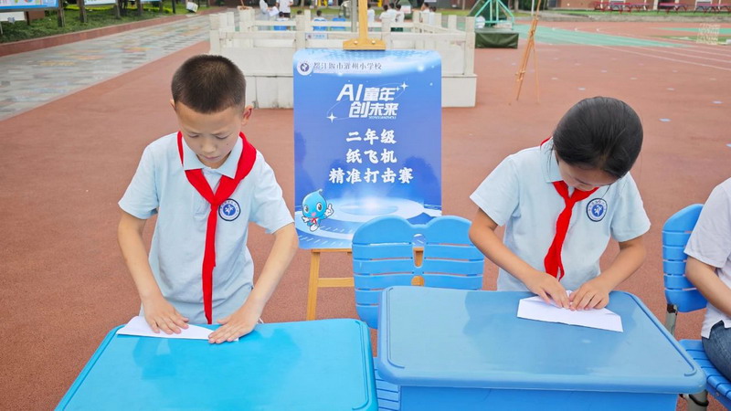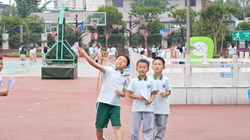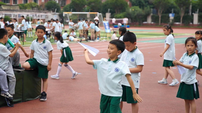精彩的纸飞机“变形记”拉开帷幕,一二年级学生纷纷化身折纸小能手,专注地折出造型各异的纸飞机,力求打造出最稳的“滑翔机”与飞得最远的“火箭机”。赛场上,一架架纸飞机乘风而起,在空中划出优美的弧线,大家都铆足了劲,渴望让自己的纸飞机成为当之无愧的“空中王者”。
