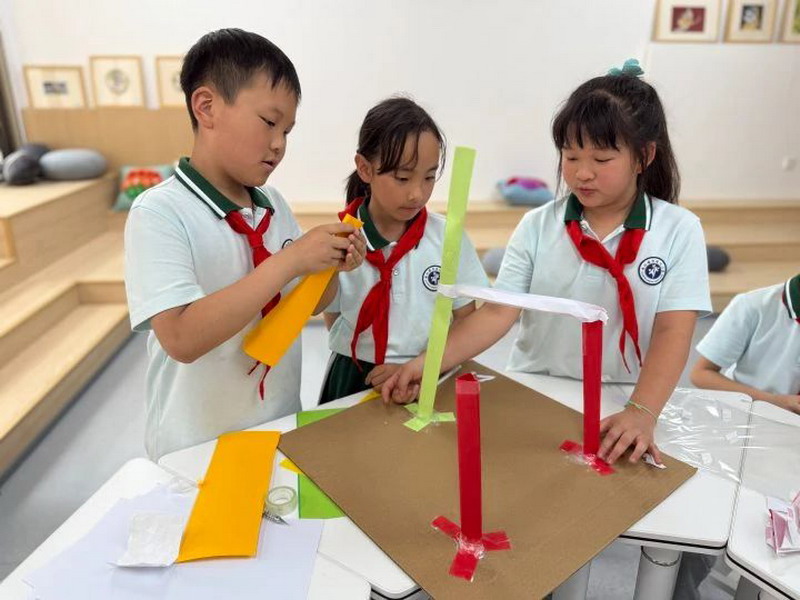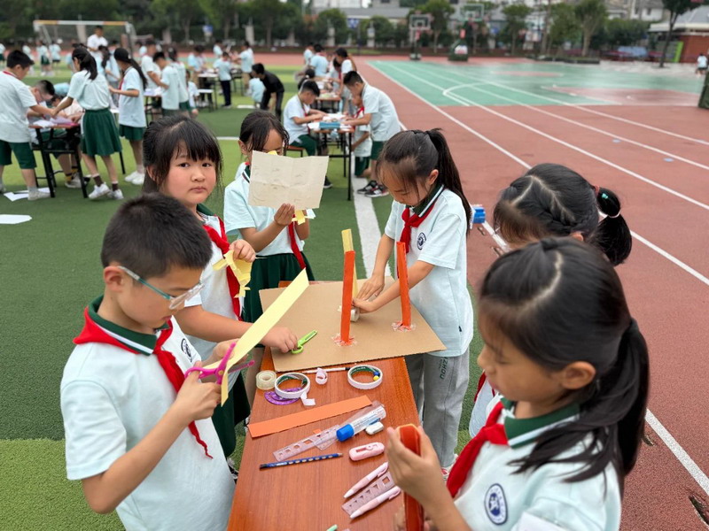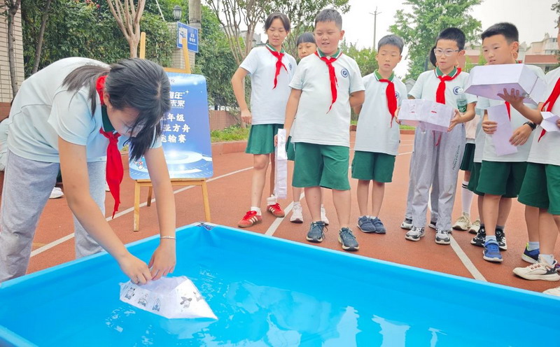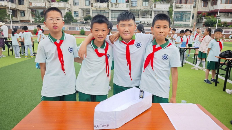 五年级学生挑战电动纸船制作,不仅要确保船体轻盈坚固,还需调试电机动力,让纸船在水面乘风破浪,并于赛后向评委详细阐述设计理念与工程难点突破。