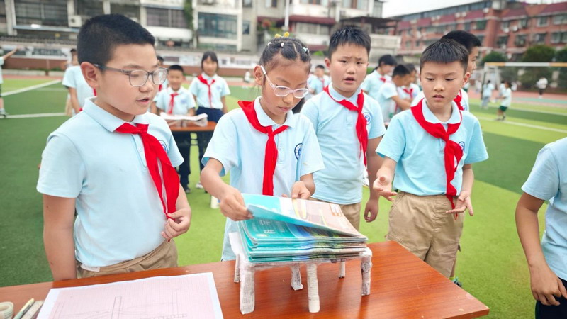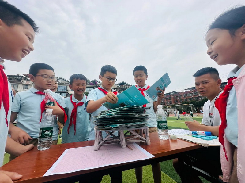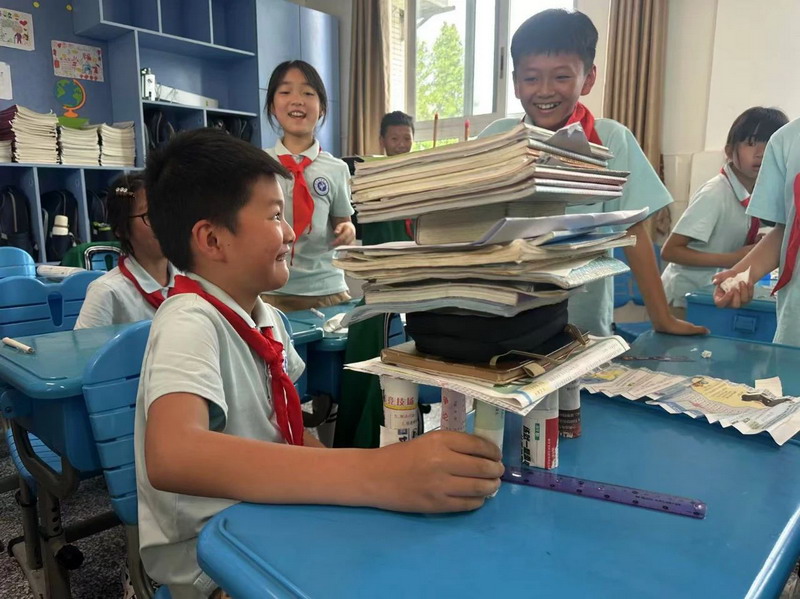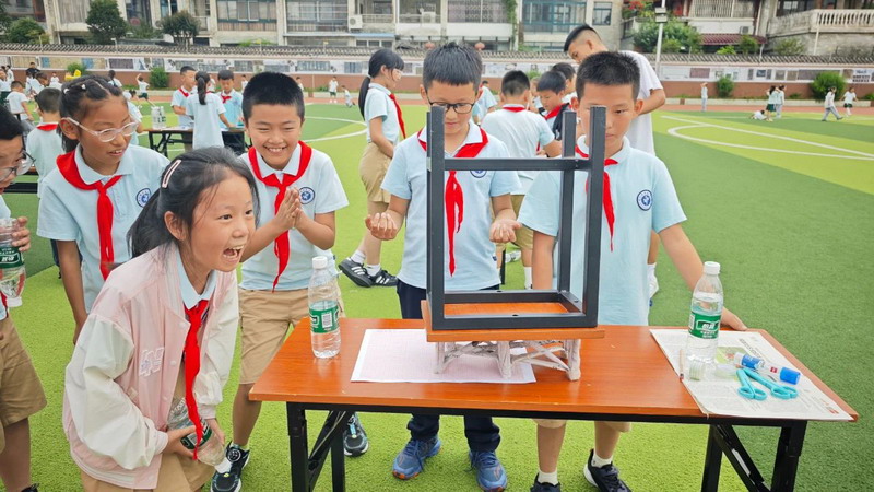 四年级选手则专注于报纸承重纸桥,通过折叠、拼接等方式增强结构强度。制作完成后,他们自信地展示承重测试过程,将力学原理融入生动的实践汇报中。