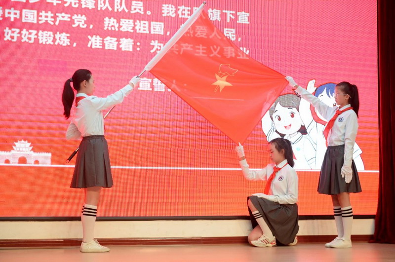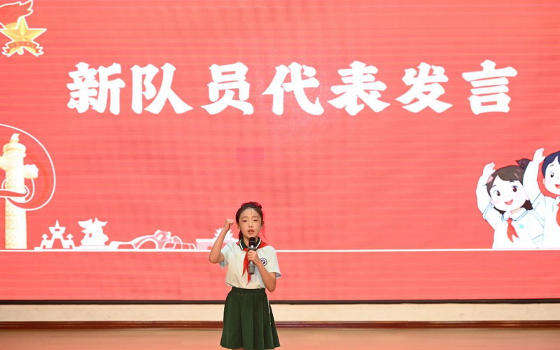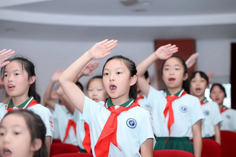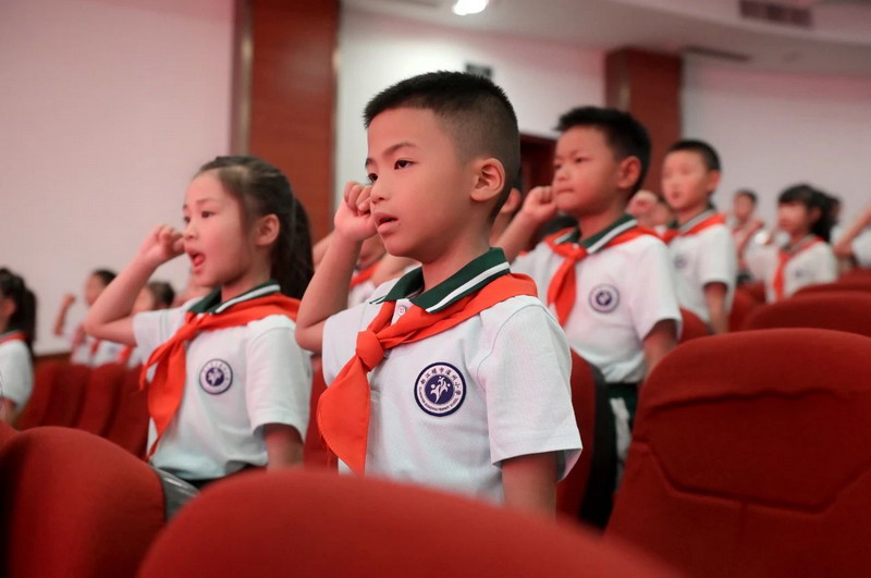在大队长的带领下,在鲜红的队旗下,新队员们高举右拳,用稚嫩的声音铿锵有力地宣誓。一句句誓言,响彻四方,一个个拳头,坚定有力。