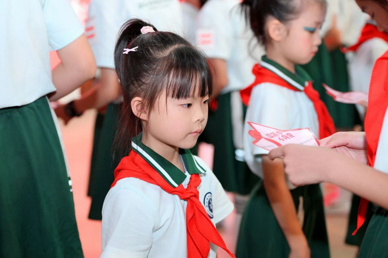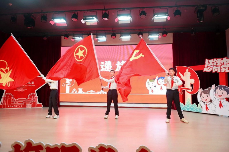 在雄浑高昂的国歌声中,鲜艳的五星红旗冉冉升起,入队仪式正式开始。党组织、团组织和少先队组织传递旗帜,把党和国家未来的希望,郑重交接。