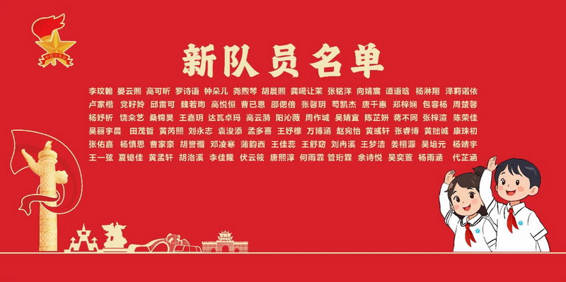 大队辅导员邓烨老师宣读新队员名单,红色信仰在这一刻薪火相传。随着一个个名字被念出,少年们有了骄傲的称号:中国少年先锋队队员。