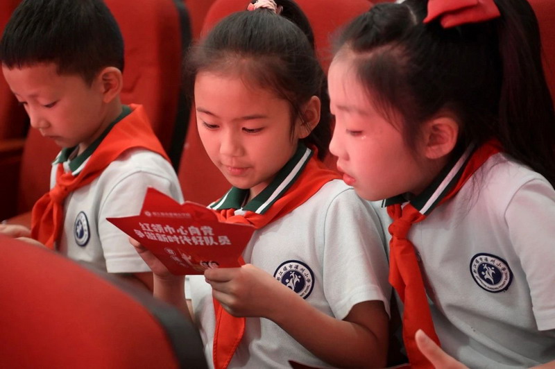 学校大队委宣读了组建一年级少先队组织的决定,新的少先队力量正式诞生。