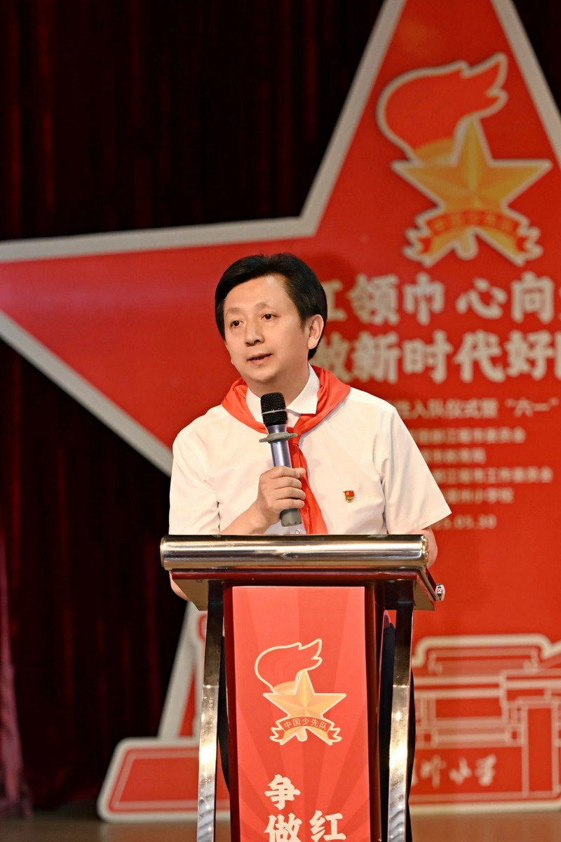 校党支部书记、少工委主任马长俊校长向新队员和新辅导员提出殷切希望和要求:让“请党放心,强国有我”的誓言,从今天的队旗下,真正走进你们的心田。让“红领巾”的光荣感、组织归属感,真正成为孩子们人生最温暖的底色。