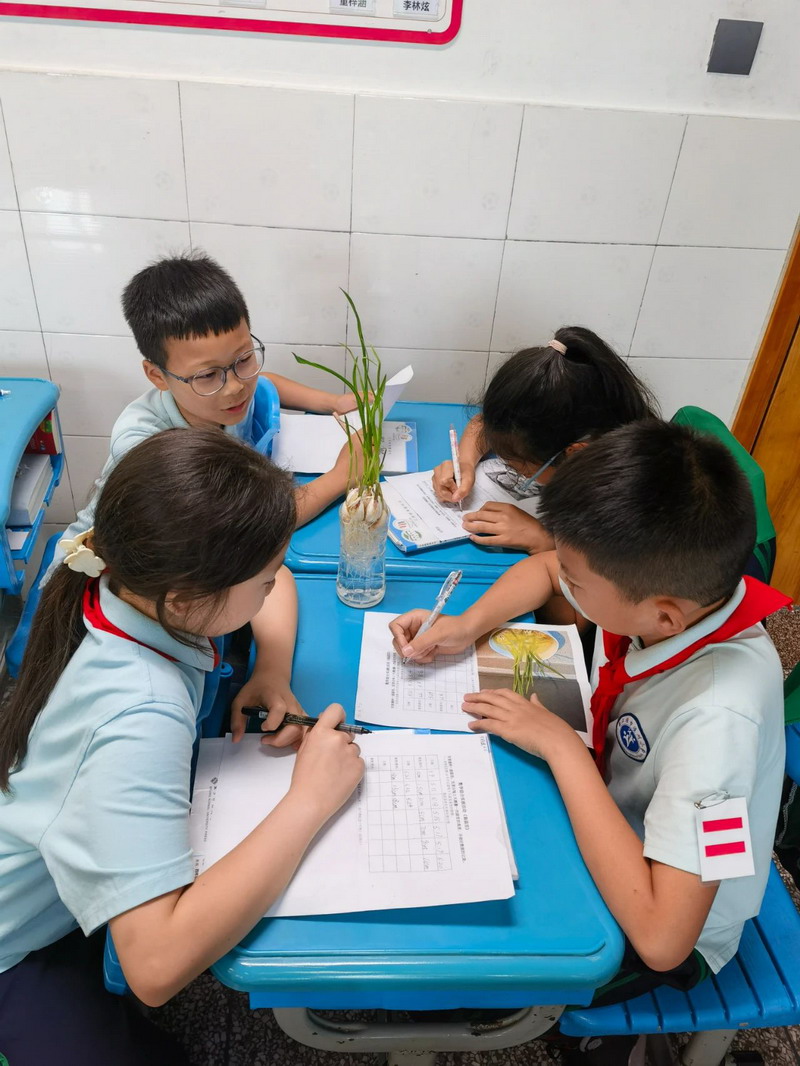 四年级数学教师以“小小园丁,播种希望”为主题,在全年级范围内开展了跨学科栽种蒜苗的活动。该活动巧妙地融合了数学、劳动和科学等学科知识。学生们亲自参与种植蒜苗,观察并精确测量蒜苗的生长高度,记录下种植的具体日期,并规划合理的种植区域。此外,学生们还通过小组讨论,探究了蒜苗生长所需的各种条件。