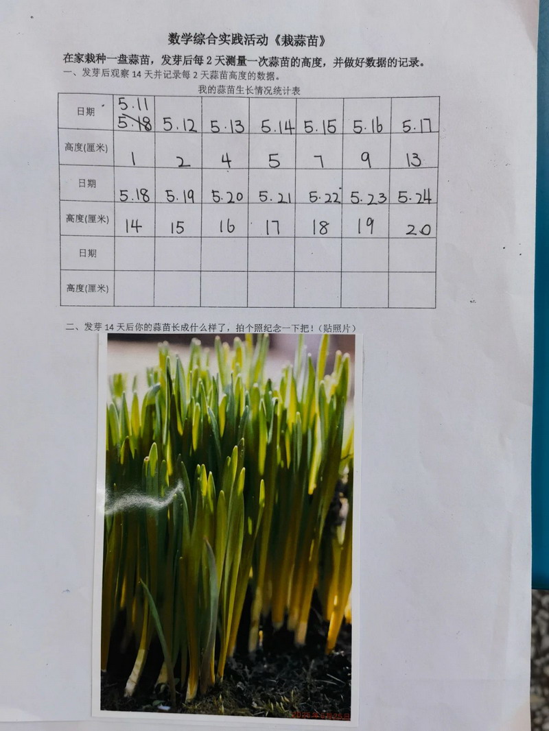 “蒜苗成长记”不仅是一次富有实践意义的数学活动,更是一次综合性的生命探索之旅,涵盖了观察、测量、思考、记录与创造等多个方面。通过亲手培育绿色希望,学生们得以深刻体验数学的温度与力量,同时领悟成长过程中的奥秘与乐趣。